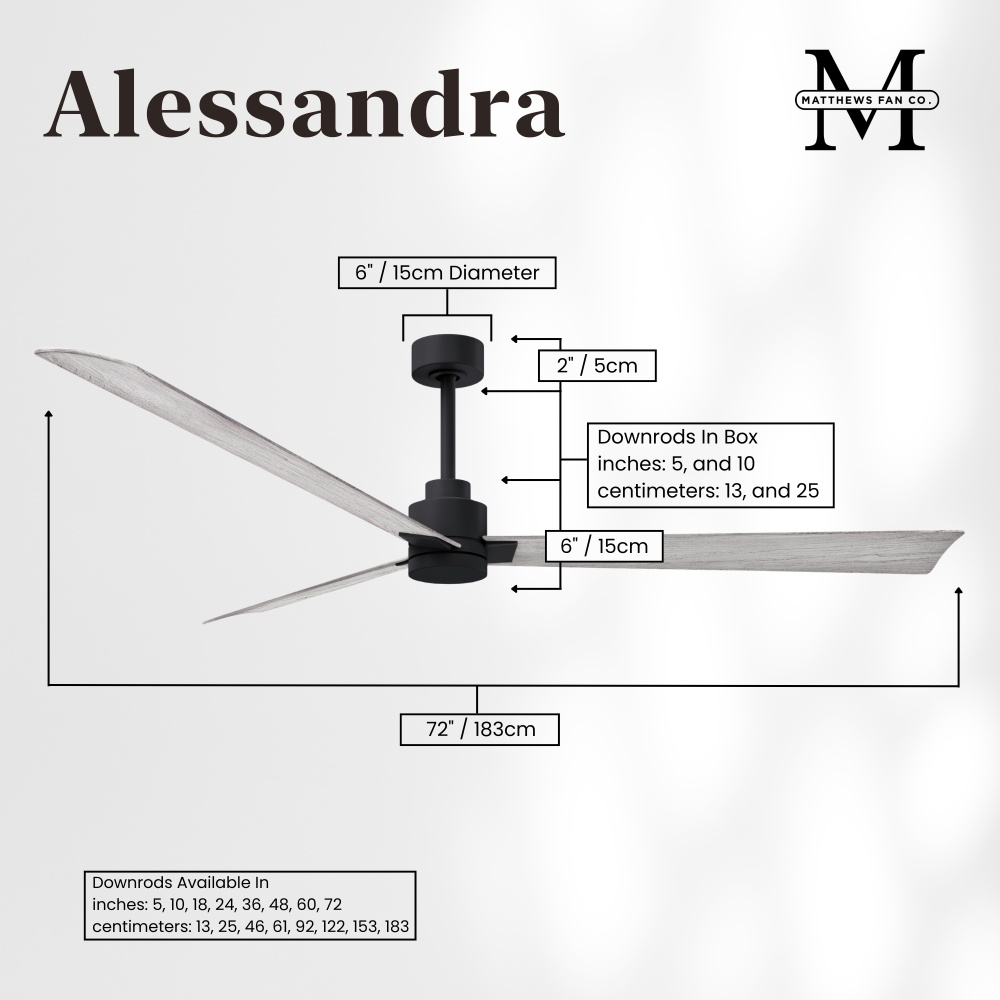 Minimal form with maximum efficiency. With a wide range of sizes, the Alessandra can accommadate any size space. This thoughtfully crafted and versatile fan will complement any aesthetic and improves the health and comfort of any room. Highly customizable, the Alessandra is available in 5 different body finishes, 6 blade options and even a color changeable light kit. Suitable for fully exposed outdoor areas. Backed by a limited lifetime warranty, our fans are of the highest quality and will dutifully perform for years to come.