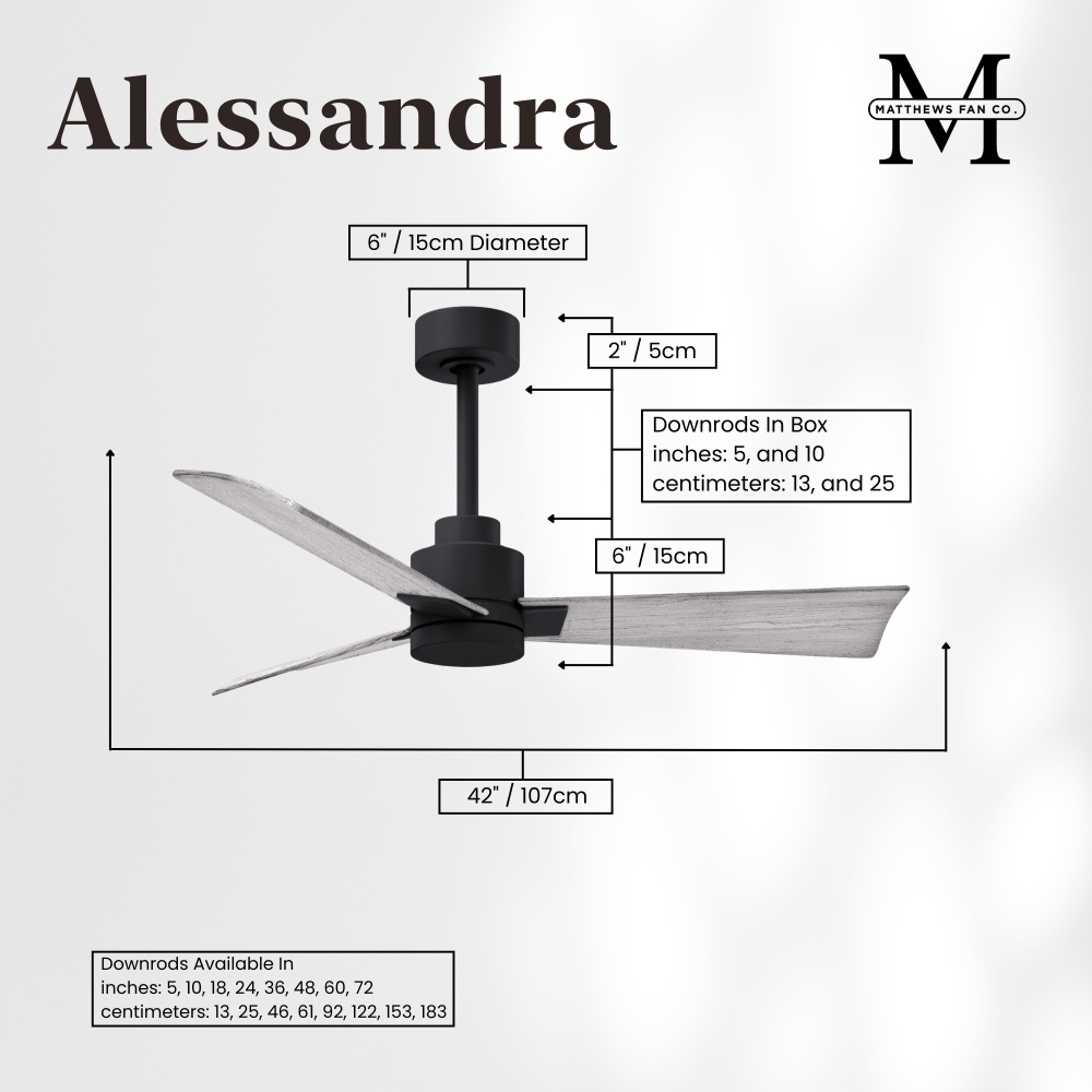 Minimal form with maximum efficiency. With a wide range of sizes, the Alessandra can accommadate any size space. This thoughtfully crafted and versatile fan will complement any aesthetic and improves the health and comfort of any room. Highly customizable, the Alessandra is available in 5 different body finishes, 6 blade options and even a color changeable light kit. Suitable for fully exposed outdoor areas. Backed by a limited lifetime warranty, our fans are of the highest quality and will dutifully perform for years to come.