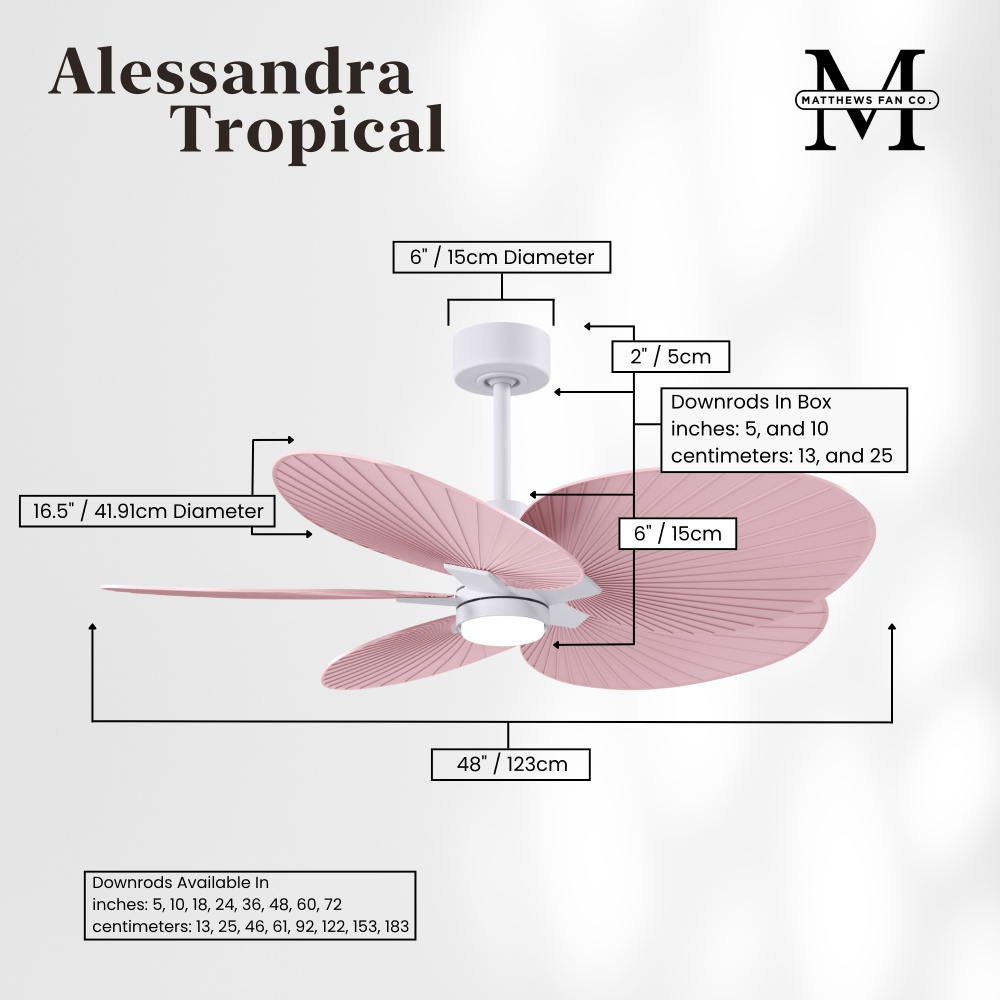 Minimal tropical form with maximum efficiency in 48". The thoughtfully crafted and versatile wet location Alessandra Tropical will complement any aesthetic and improve the health and comfort of any room. Highly customizable, the Alessandra Tropical is available in 5 different body finishes, 10 blade finish options and color changing light kit. Backed by a limited lifetime warranty, our fans are of the highest quality and will dutifully perform for years to come.