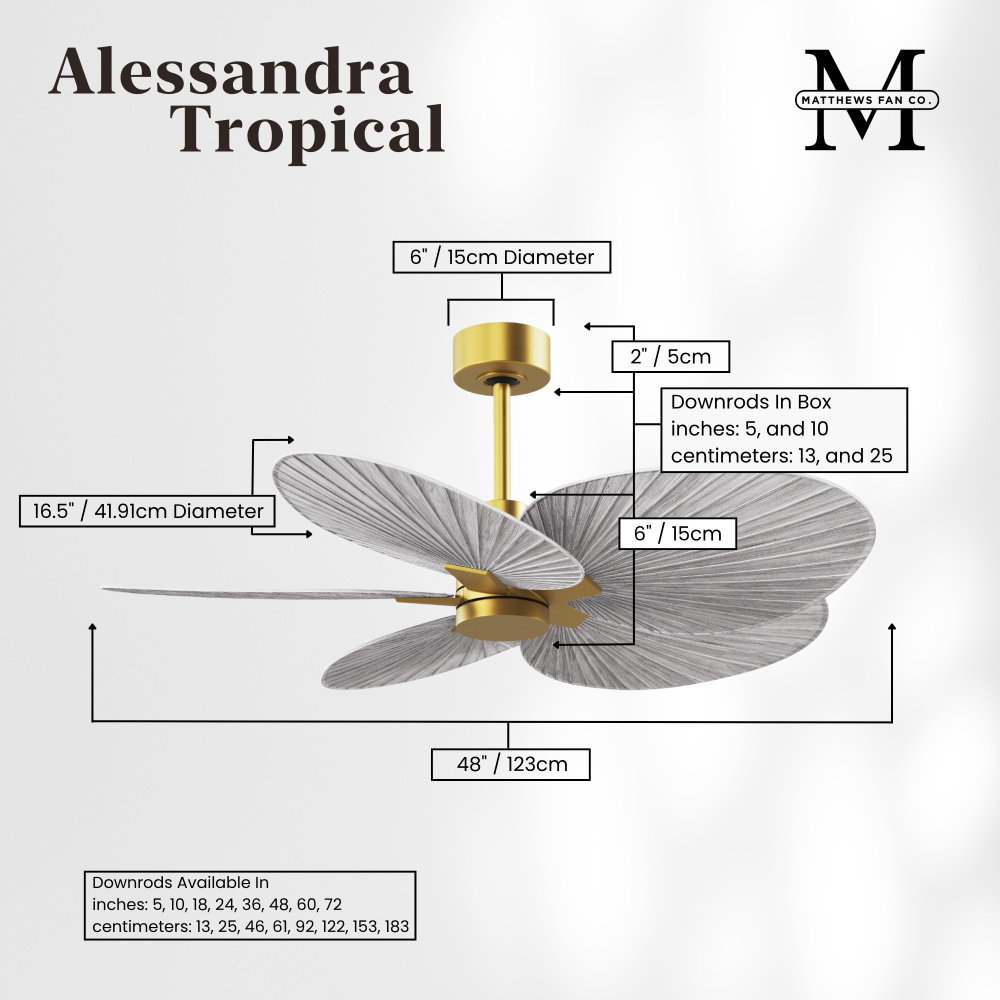 Minimal tropical form with maximum efficiency in 48". The thoughtfully crafted and versatile wet location Alessandra Tropical will complement any aesthetic and improve the health and comfort of any room. Highly customizable, the Alessandra Tropical is available in 5 different body finishes, 10 blade finish options and color changing light kit. Backed by a limited lifetime warranty, our fans are of the highest quality and will dutifully perform for years to come.