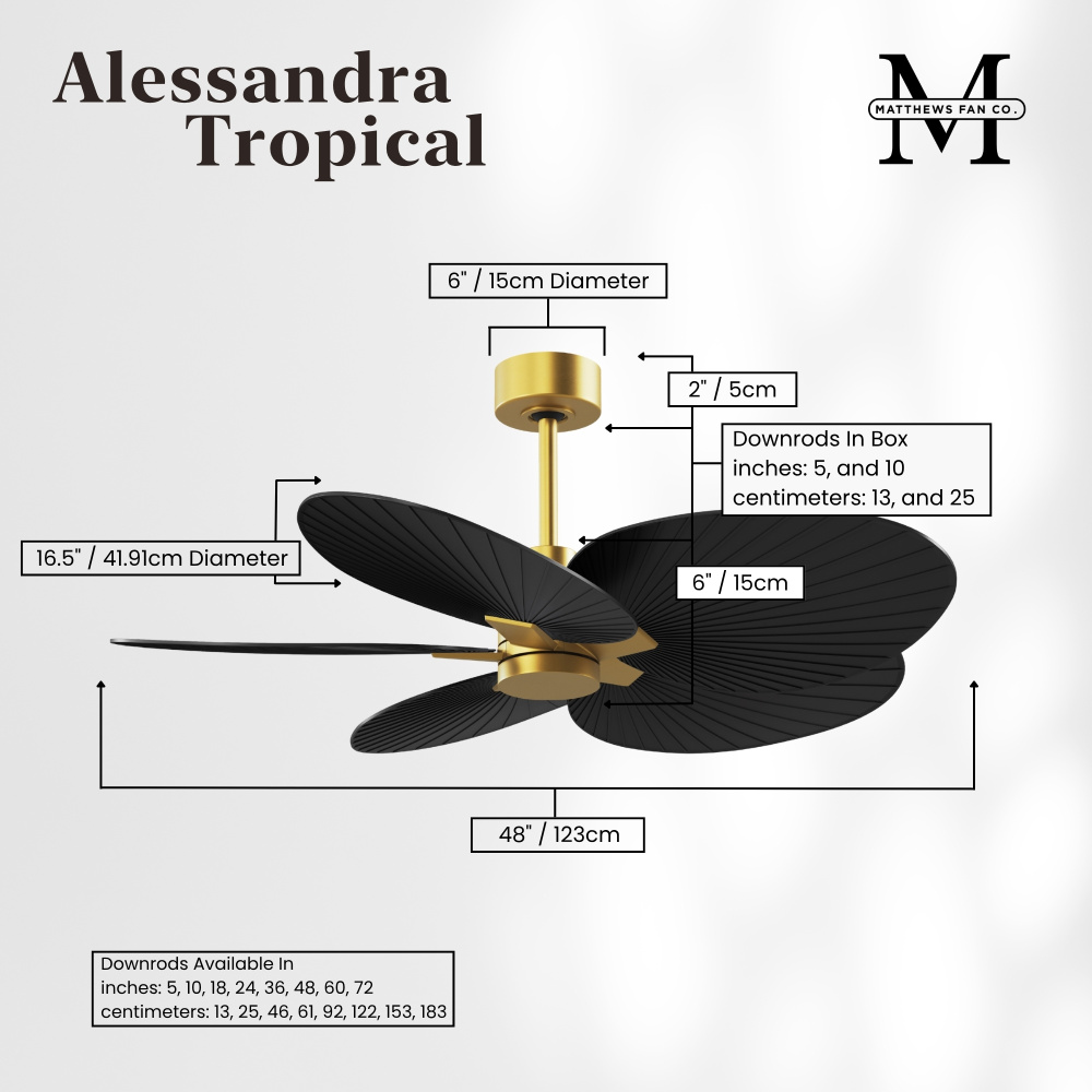Minimal tropical form with maximum efficiency in 48". The thoughtfully crafted and versatile wet location Alessandra Tropical will complement any aesthetic and improve the health and comfort of any room. Highly customizable, the Alessandra Tropical is available in 5 different body finishes, 10 blade finish options and color changing light kit. Backed by a limited lifetime warranty, our fans are of the highest quality and will dutifully perform for years to come.