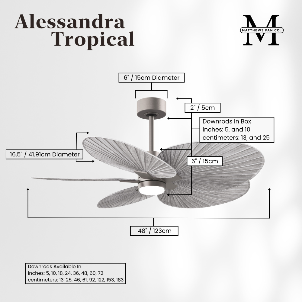 Minimal tropical form with maximum efficiency in 48". The thoughtfully crafted and versatile wet location Alessandra Tropical will complement any aesthetic and improve the health and comfort of any room. Highly customizable, the Alessandra Tropical is available in 5 different body finishes, 10 blade finish options and color changing light kit. Backed by a limited lifetime warranty, our fans are of the highest quality and will dutifully perform for years to come.
