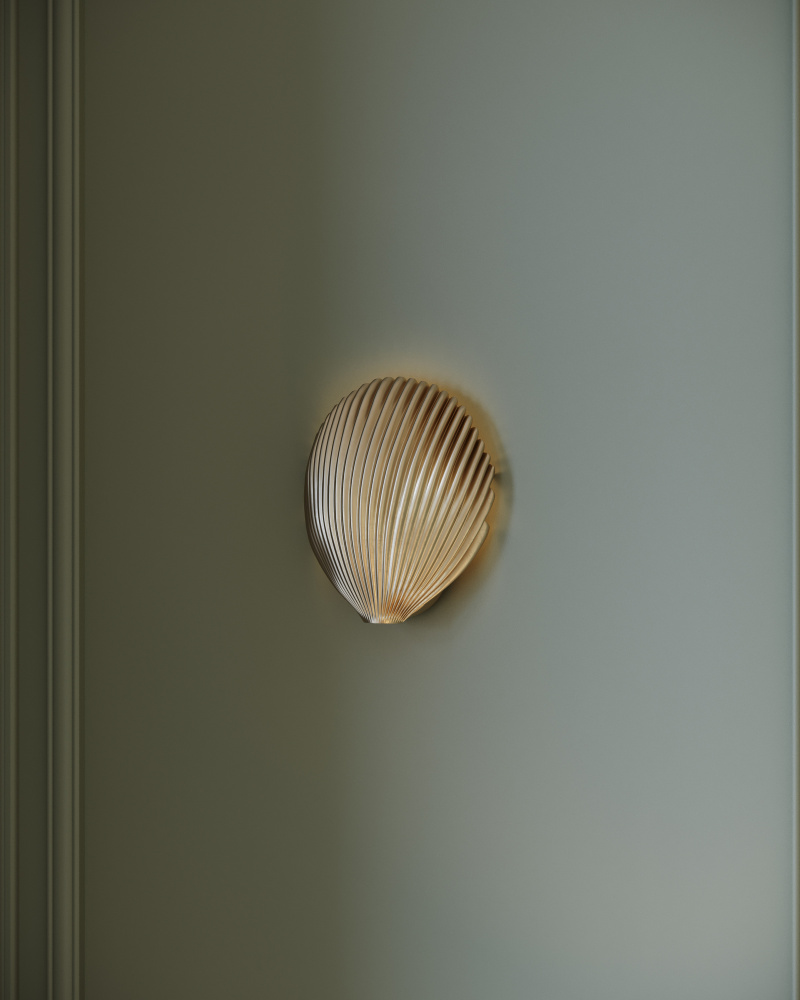 The Alexine Wall Sconce is a pretty shell-shaped gold sconce that washes a wall with splashes of light. Made of brass in an antique brass finish, the sconce has a single bulb.