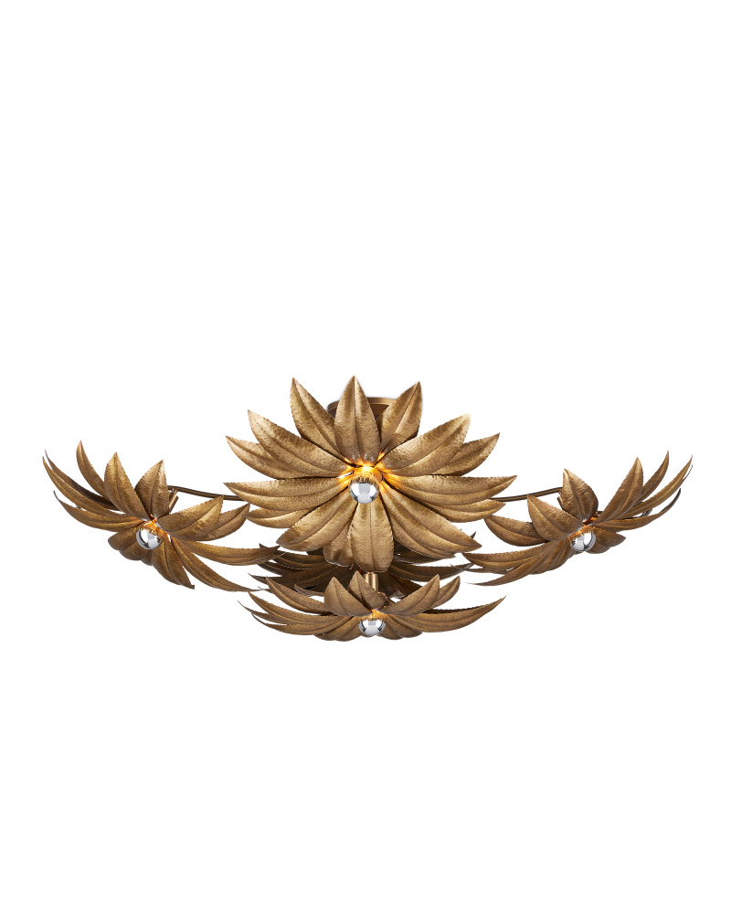 The Alithea Medium Semi-Flush Mount is made of brass in an antique brass finish. The petals on this nature-inspired gold sconce have been hand-hammered to give them lifelike personality. The floral semi-flush will be a pretty addition to any space it illuminates. The button-like bulbs bring the metal a luminous sheen.