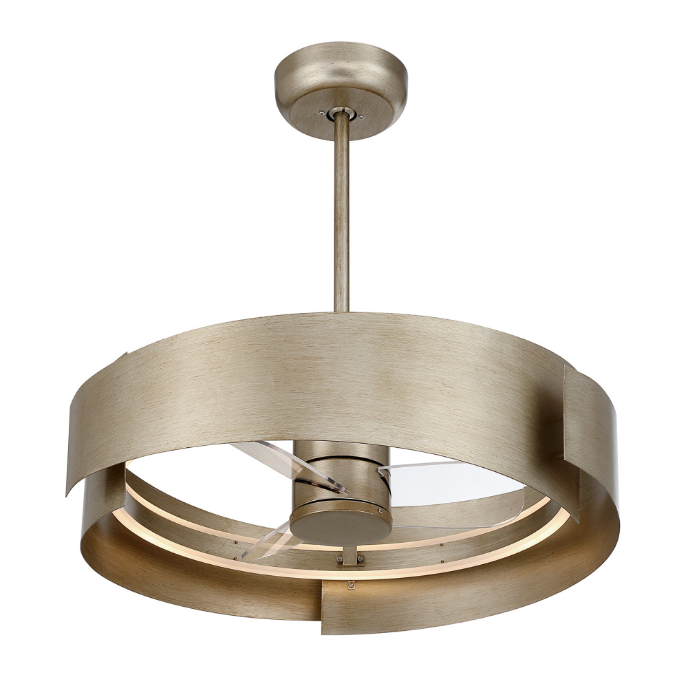 The Savoy House Amiena Fan D’Lier brings sculptural elegance into motion, with sweeping ribbons in a textured Silver Patina finish that seem to swirl around the light. Integrated LED illumination fills the fixture with a bright, inviting glow, while the efficient DC motor keeps air flowing quietly and smoothly. A handheld remote control adds easy, at-your-fingertips comfort. Amiena is 28" tall and 28" wide and includes both a 4" and 18" downrod. This innovative design is part of the Savoy House Fan D’Lier collection - exclusive creations that fuse the beauty of a chandelier with the refreshing performance of a ceiling fan.