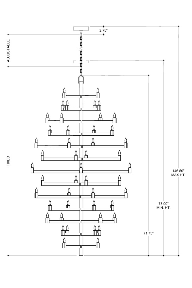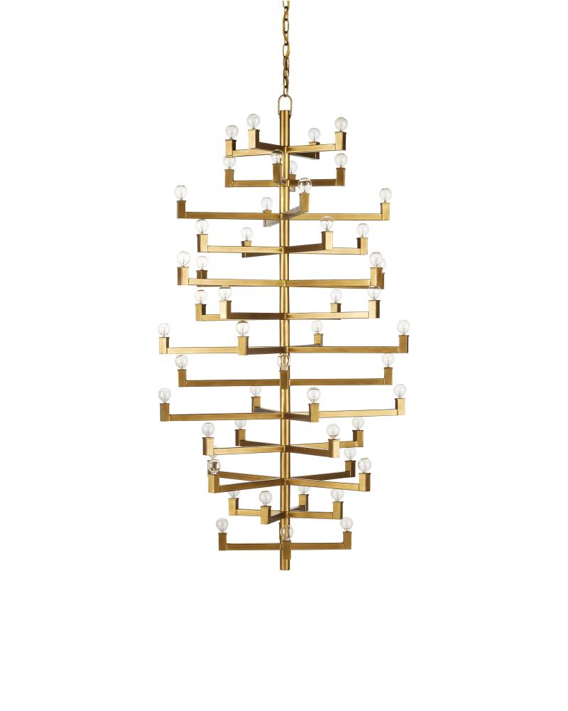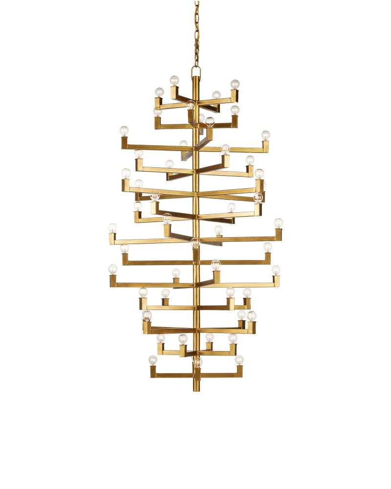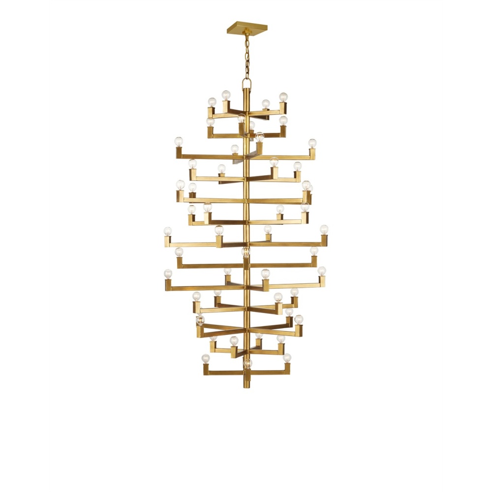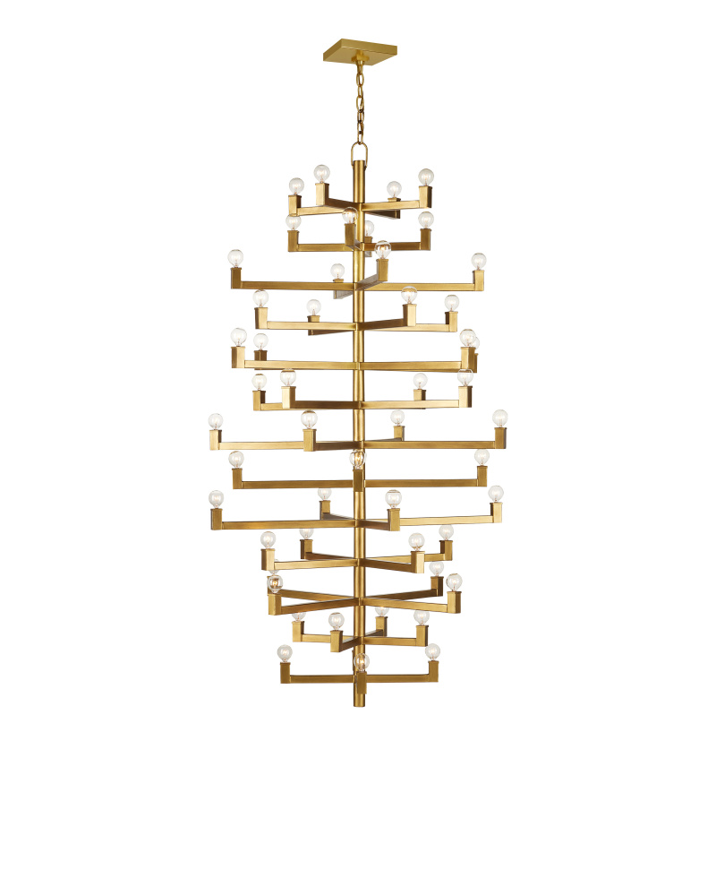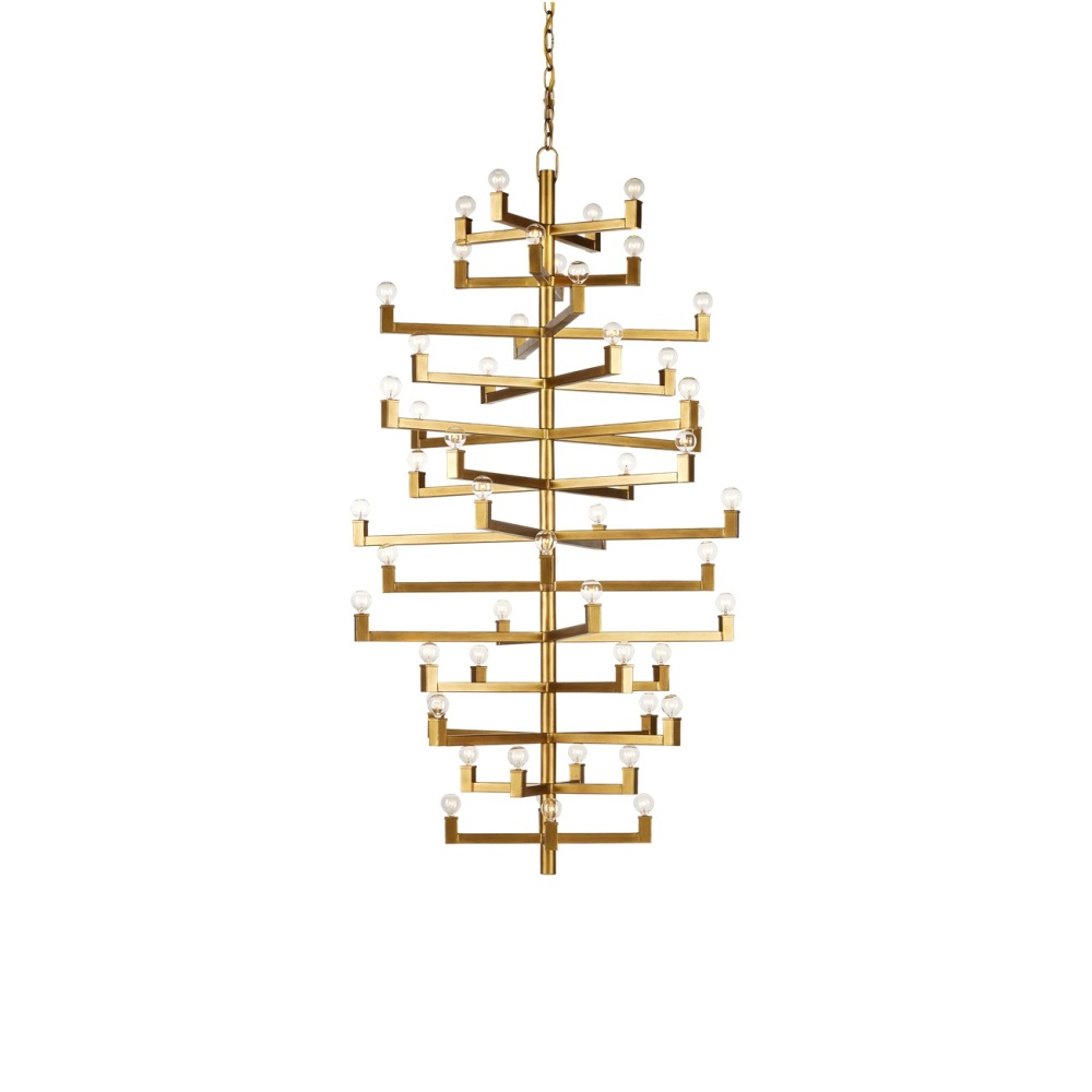 Clean articulated arms with resolute geometries make the big, bold Andre Grande Chandelier a powerful statement that can easily swing from contemporary to transitional styles, and many in between. Made of wrought iron in a brass finish, the gold chandelier will take on other personalities when the shapes of the bulbs are changed. Tall foyers and great rooms with high ceilings are perfect spots for this luminous modern light fixture with a stunning 52 lights. Adjustable from 78" to 169" with use of included chain/rod kit/cable. If your space calls for a longer drop, additional chain/rods/cable is available for purchase.