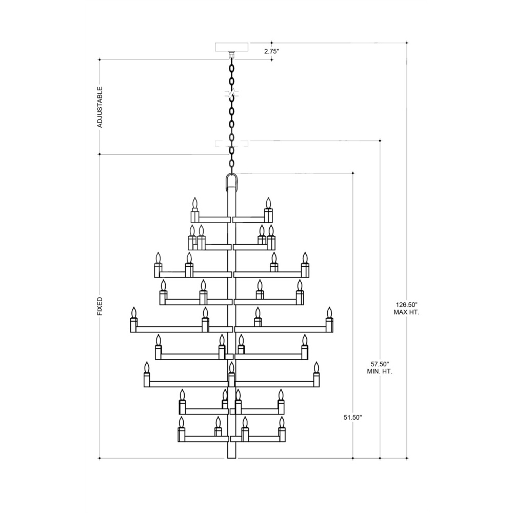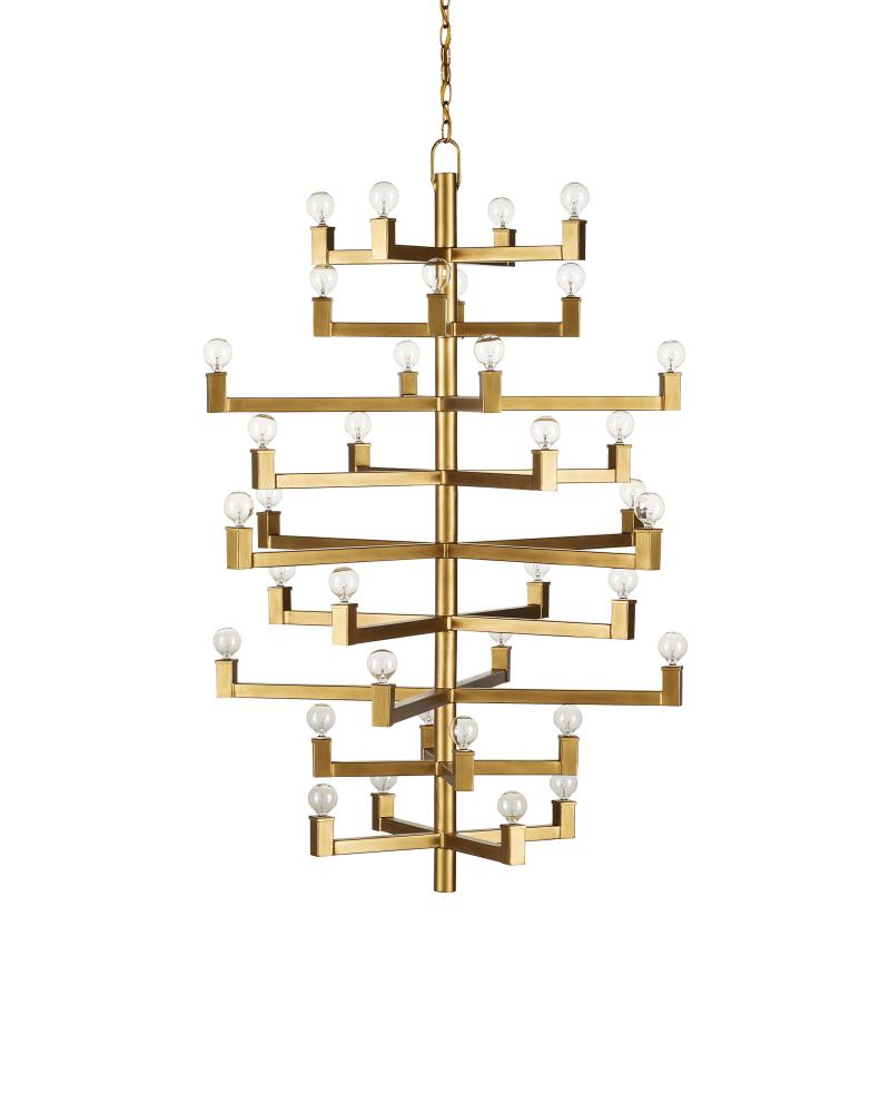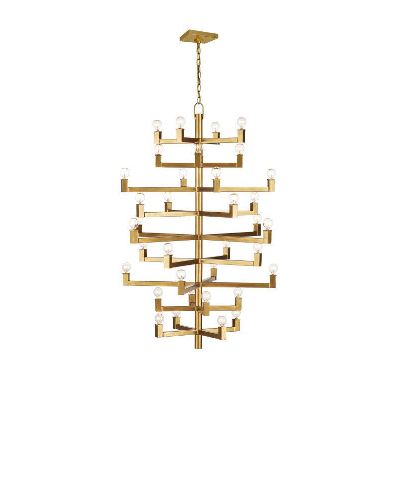 Clean articulated arms with resolute geometries make the big, bold Andre Large Chandelier a powerful statement that can easily swing from contemporary to transitional styles, and many in between. Made of wrought iron in a brass finish, the gold chandelier will take on other personalities when the shapes of the bulbs are changed. Tall foyers and great rooms with high ceilings are perfect spots for this luminous modern light fixture, boasting an impressive 36 lights. Adjustable from 57.5" to 126.5" with use of included chain/rod kit/cable. If your space calls for a longer drop, additional chain/rods/cable is available for purchase.