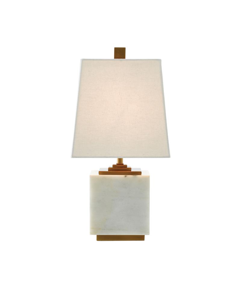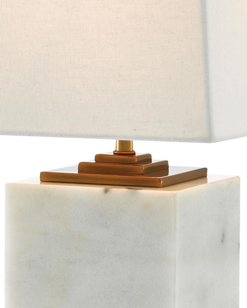 The Annelore Table Lamp is made from a block of white marble with stacked plates of metal above its body and a single-slab base below it. Along with the tall metal finial in an antique brass finish, these elements contrast the marble and the white linen shade. for a black version of this lamp, see our Mairin Table Lamp.