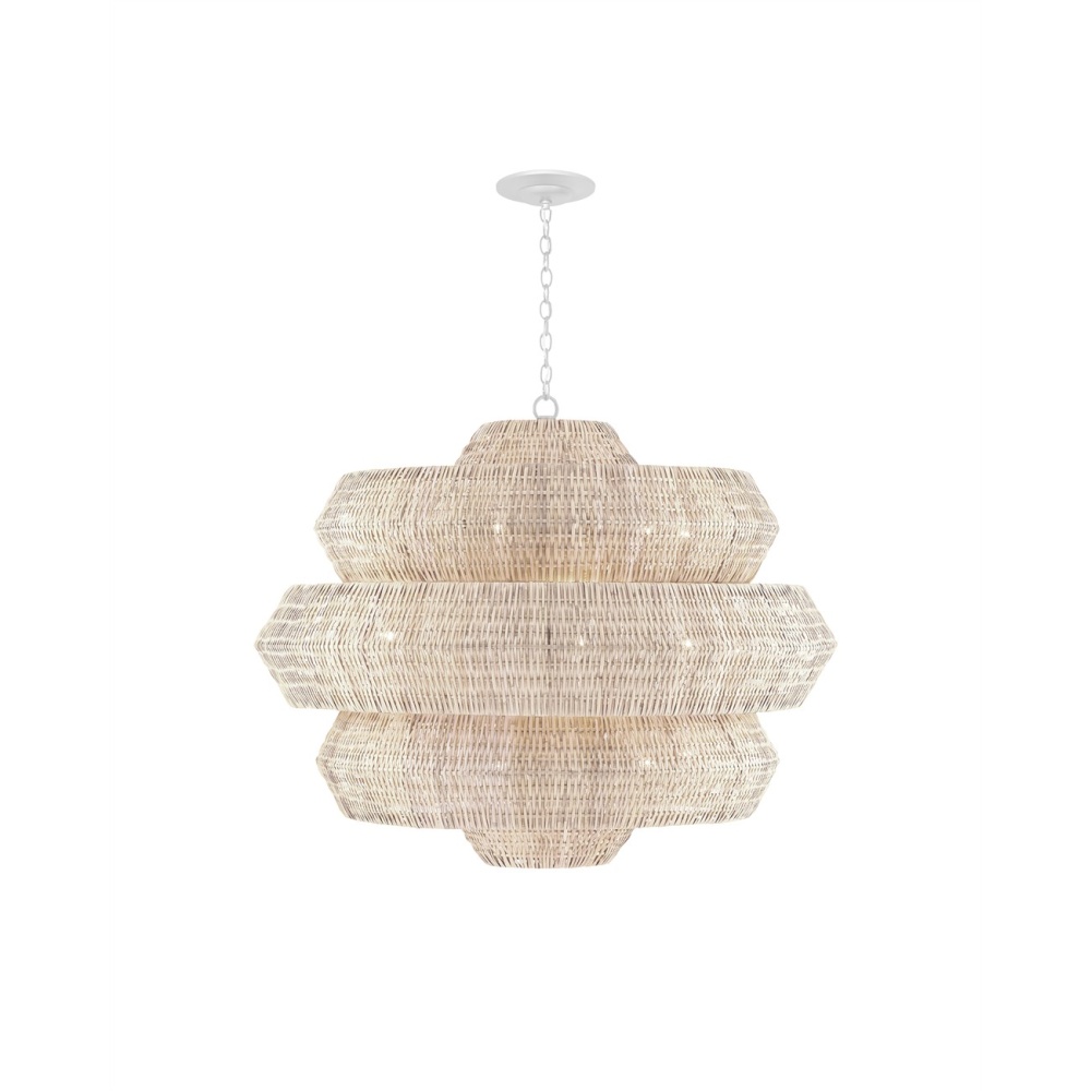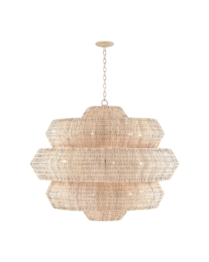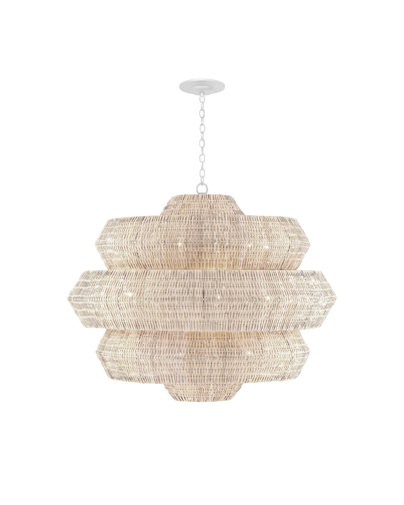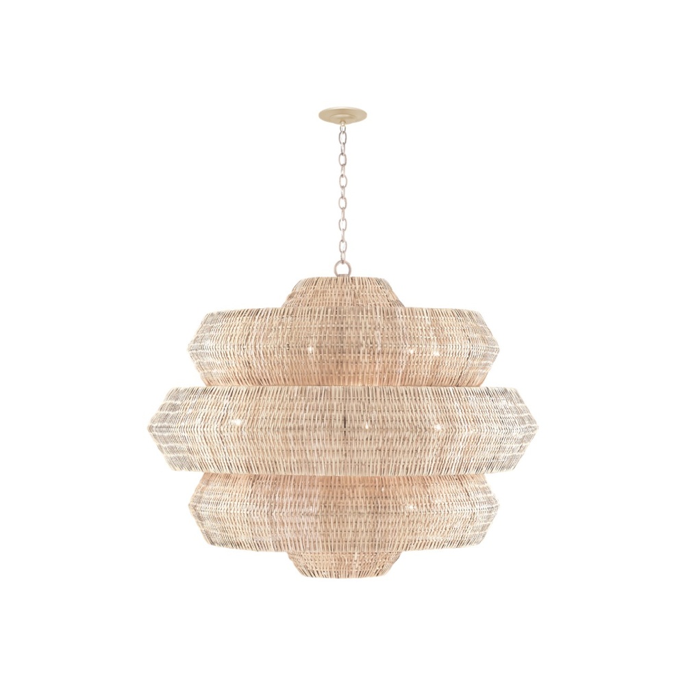 Painstakingly woven by artisans who use traditional techniques, the Antibes Grande White Chandelier is a marriage of artistry and high-quality construction. Natural bleached rattan forms the body of this geometric chandelier shaped by a wrought iron frame in a snow-white finish. This is a large chandelier at 48 inches in diameter. The 18 lights reflect through the tight weave to create subtle patterns when the chandelier is illuminated. Adjustable from 48" to 139.5" with use of included chain/rod kit/cable. If your space calls for a longer drop, additional chain/rods/cable is available for purchase.