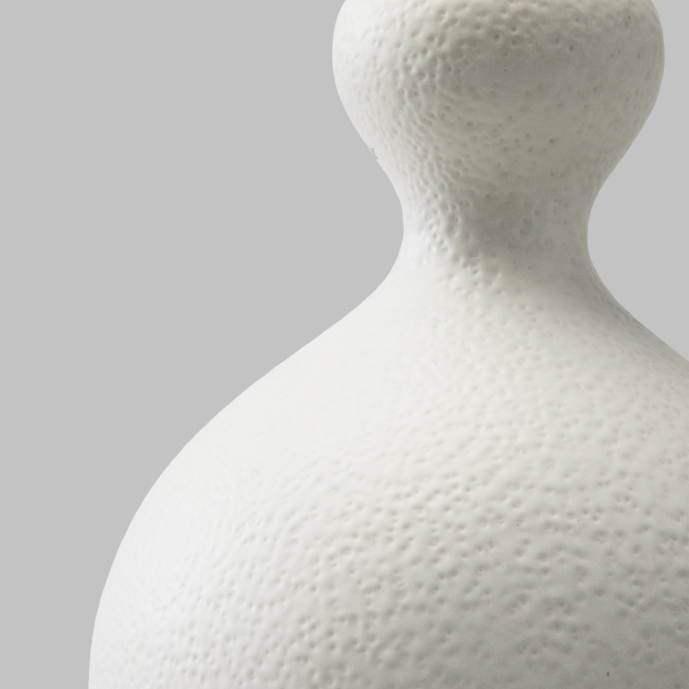Curvy glass body glimmers in the light diffused beneath its contemporary drum shade.