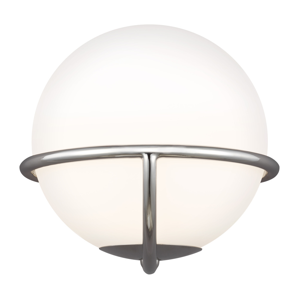 The modernist Apollo impresses with perfectly balanced White Opal Etched Glass globes that gently rest within a spherical Burnished Brass or Polished Nickel frame