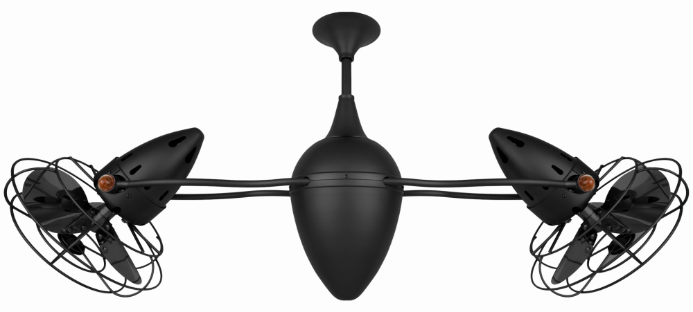The Ar Ruthiane's unique hourglass support arms grasp bullet-shaped motor housings which rotate about its teardrop center. The fan heads can be infinitely positioned in 180-degree arcs for optimum air movement; the greater the angles of the motors to the horizontal support rods (up or down), the faster the axial rotation. A slow, controlled axial rotation is achieved by both fan head position and fan blade speed.
