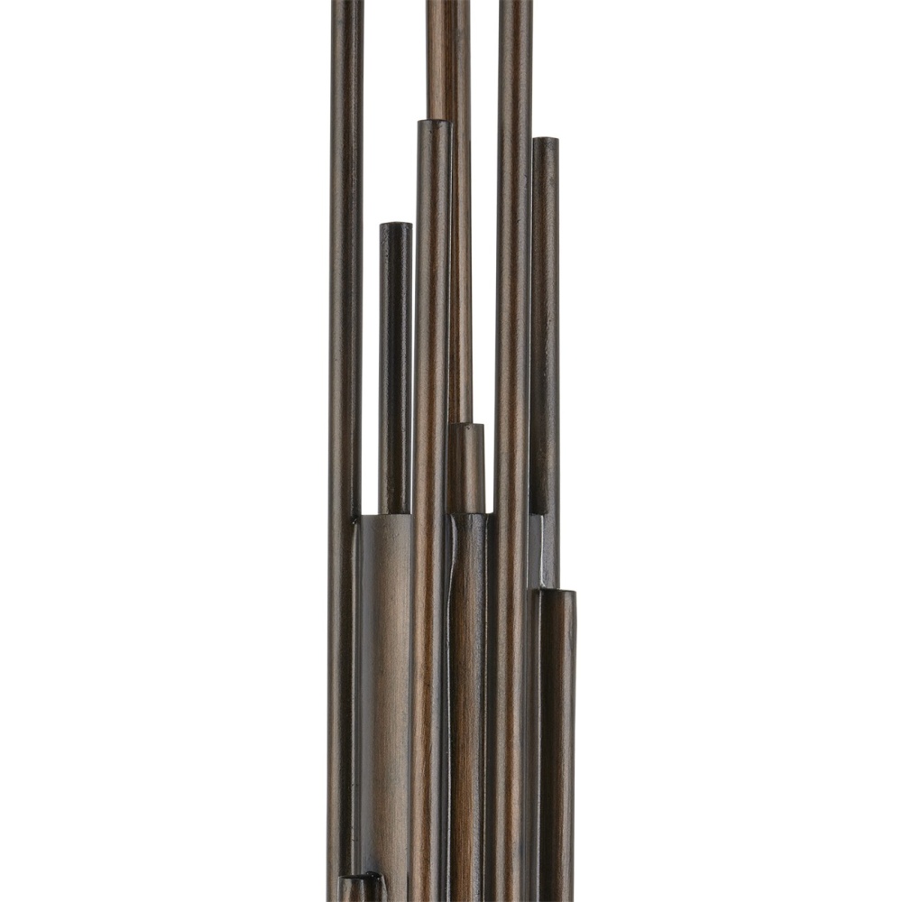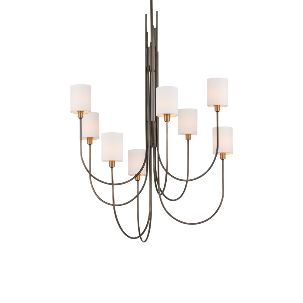 The Archetype Chandelier has a beautifully arcing form. The design details that make it special include the staggered curving lines of the thin pieces of metal at the bottom and the graduating placement of the straight ends as they attach to the stem. The Statuary Bronze finish is also a sophisticated design detail, as is the fact that the bobeches are finished in brass. The off-white linen shades sit directly on the bobeches and create a lovely glow. Adjustable from 52.25" to 94.25" with use of included chain/rod kit/cable. If your space calls for a longer drop, additional chain/rods/cable is available for purchase.