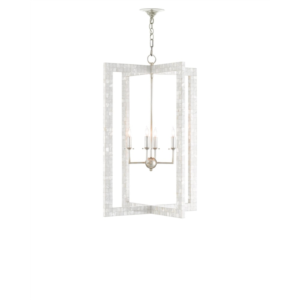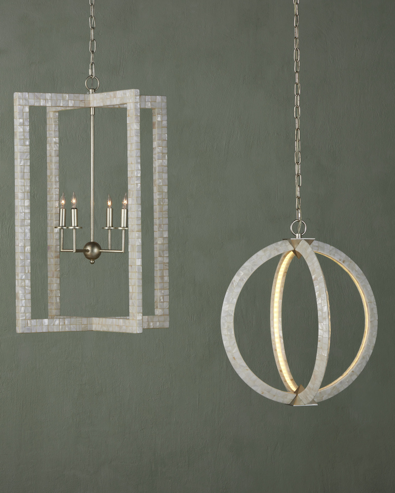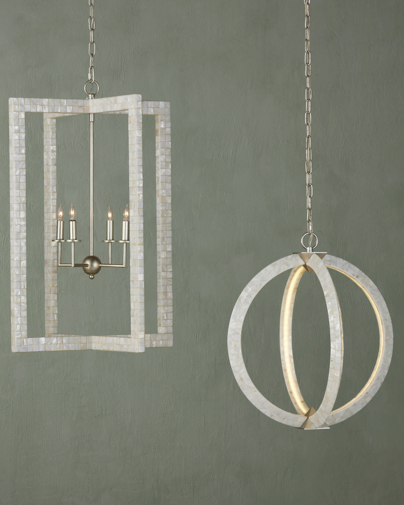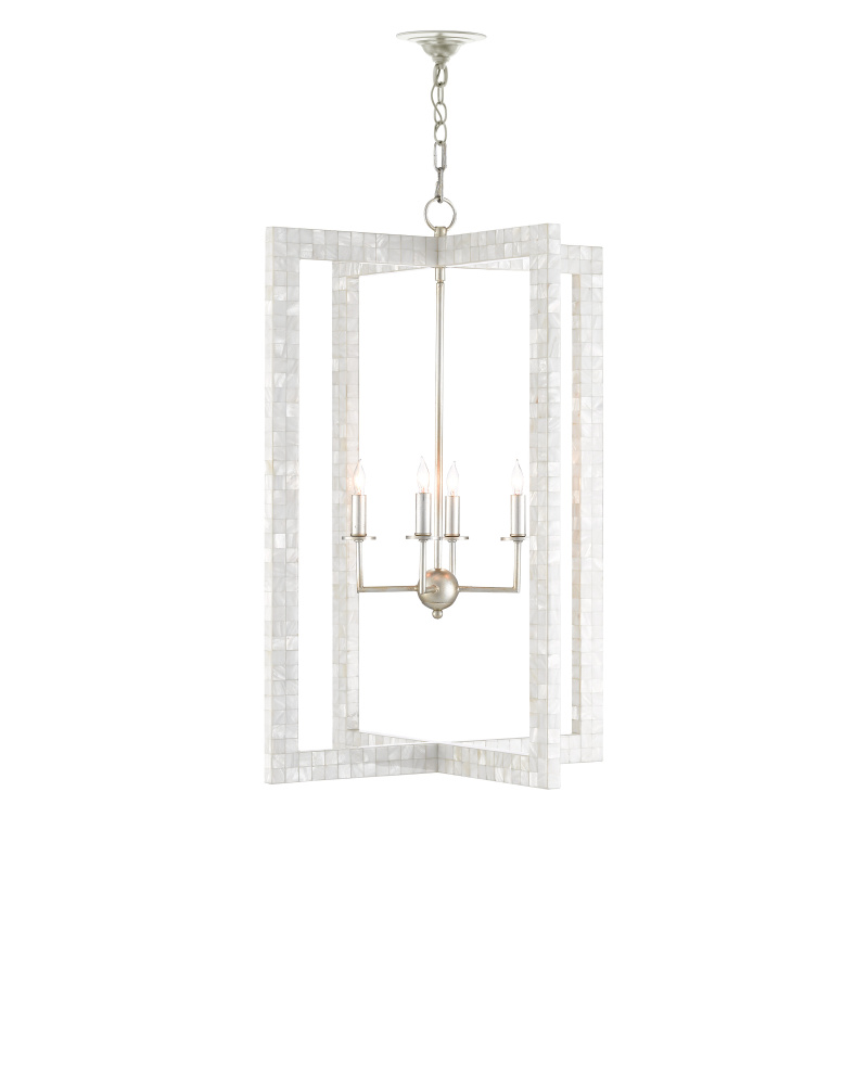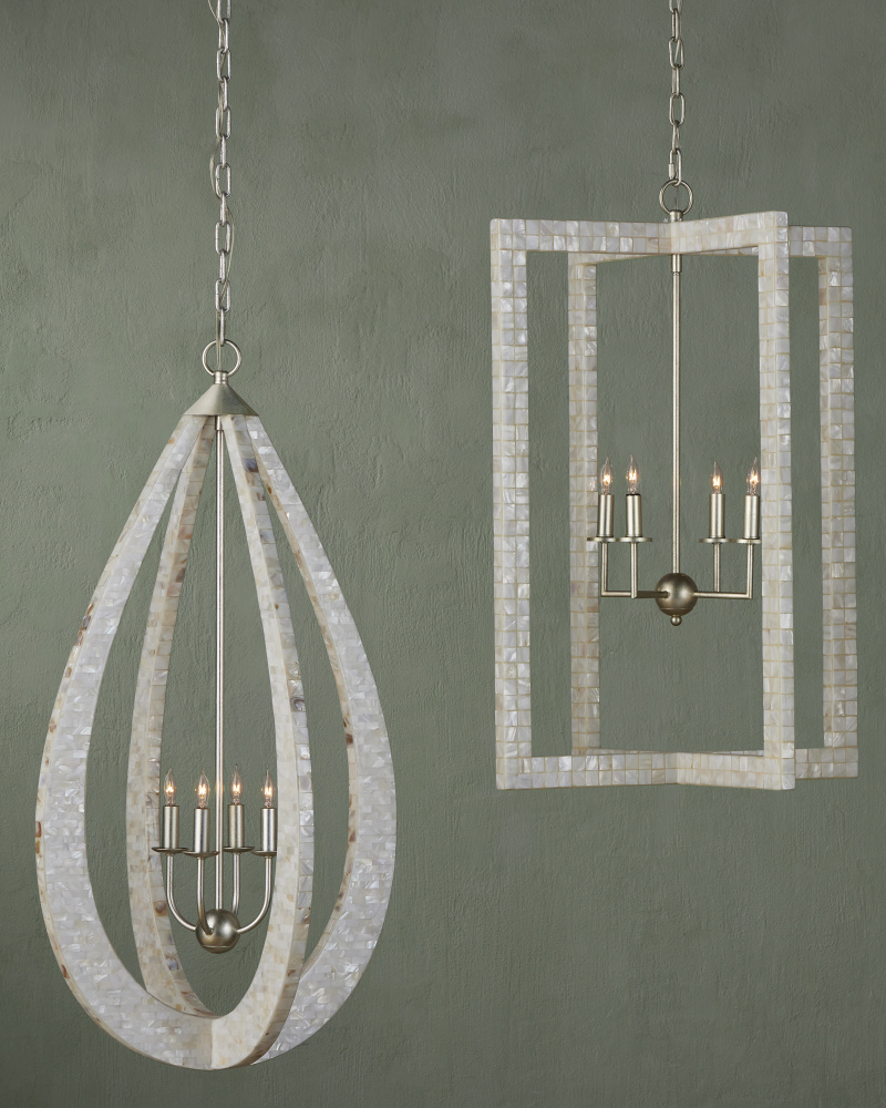 With thin rectangles covered in hand-applied mother-of-pearl mosaic, our Arietta Chandelier is an example of how talented our finish artisans are when it comes to handcrafted surfaces. The metal in a contemporary silver leaf finish enhances the glow of the fixture when the four lights of the silver chandelier illuminate. Adjustable from 38.75" to 106.75" with use of included chain/rod kit/cable. If your space calls for a longer drop, additional chain/rods/cable is available for purchase.