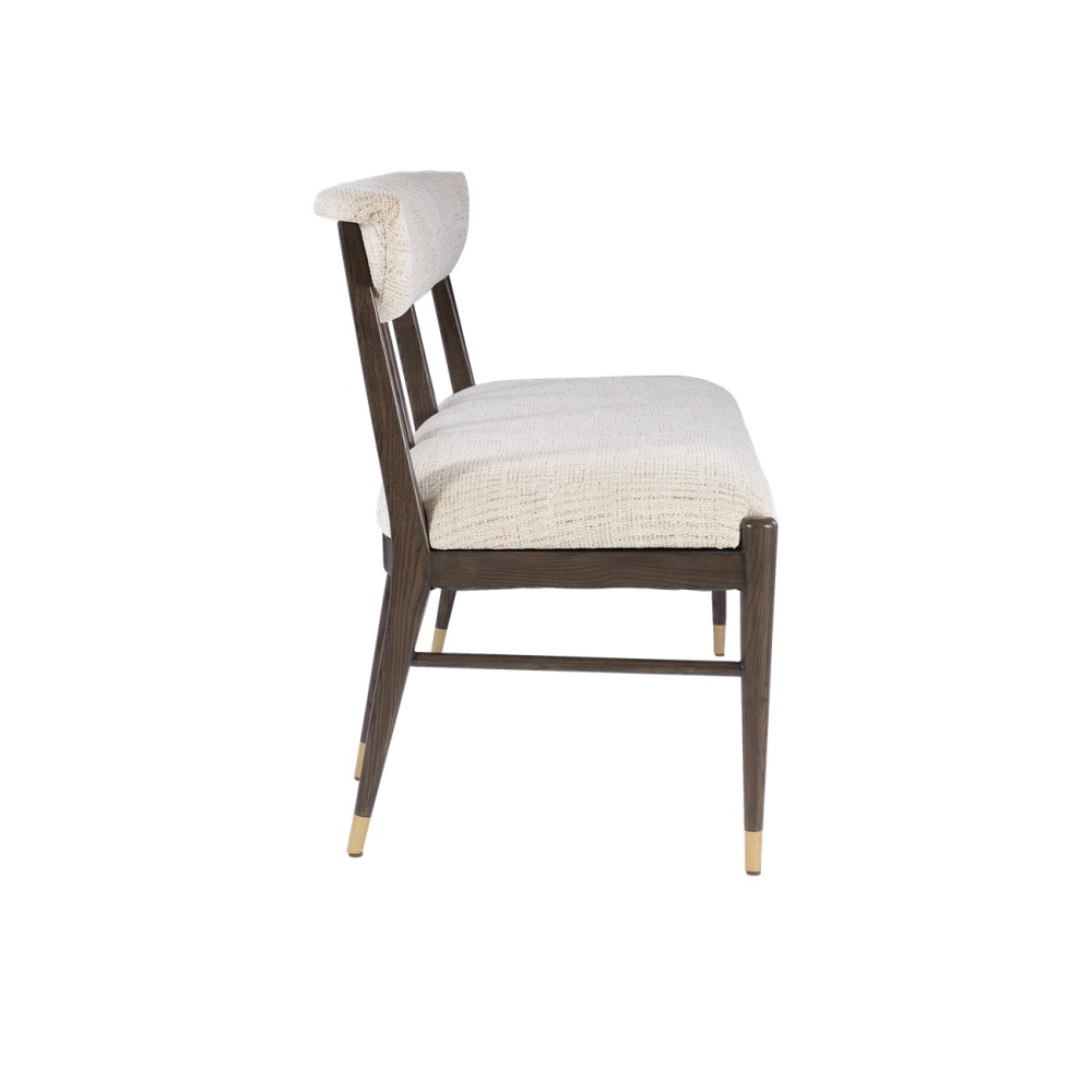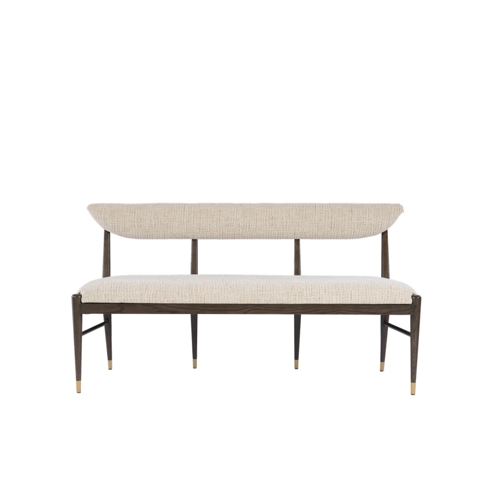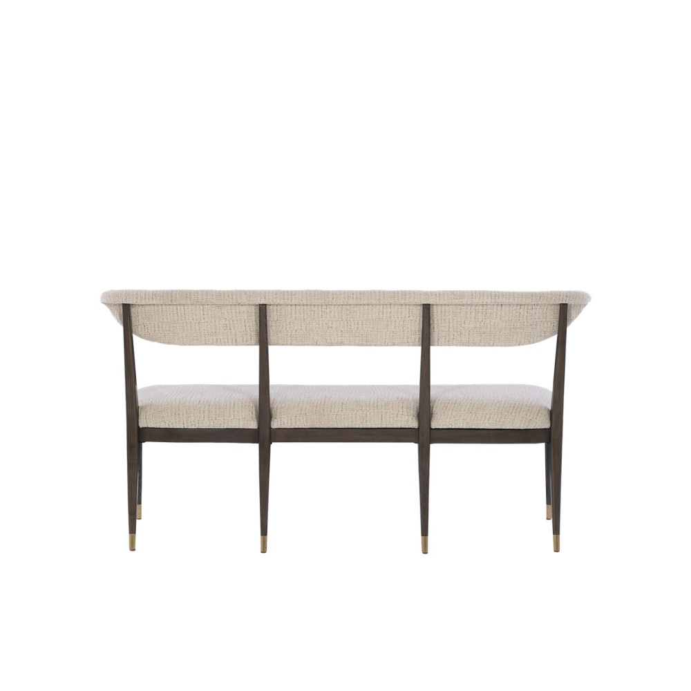 The Arlan Coffee Bench, which is made of ash wood in a coffee brown finish, has tailored contemporary lines. The back and seat are covered in a nubby performance fabric called Busio Desert, and the tapered legs that run along the sides and back are sophisticated design details on this piece of upholstery. The ferrules on the dark brown and white bench are in an antique brass finish.