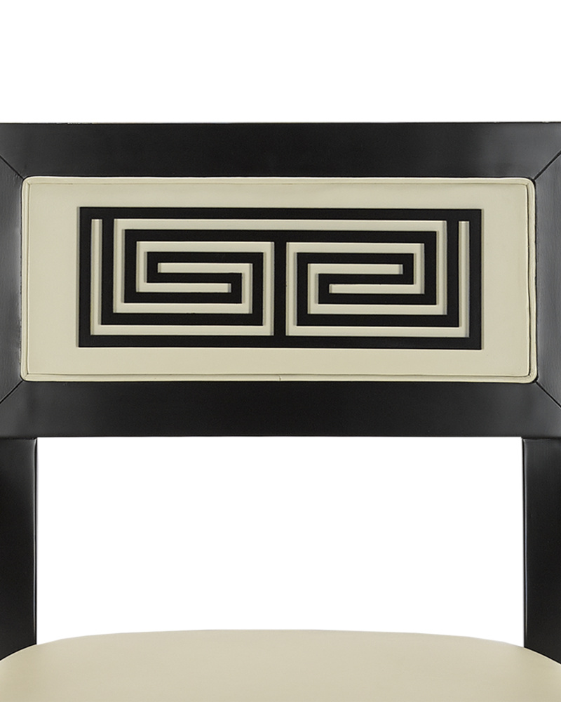 Barry Goralnick designed the Artemis Leather Armchair. with its Greek Key wood inlay in the inside back, leather on the outside back, and brass ferrules, the chair is an update on the classic Klismos chair. Most Klismos chairs are more known for their look than comfort. This chair is designed for comfort first, with modern proportions that include a wider, deeper seat. Made of Beech wood in a caviar black finish, the dark brown chair has a tailored feel with its milk leather upholstery.
