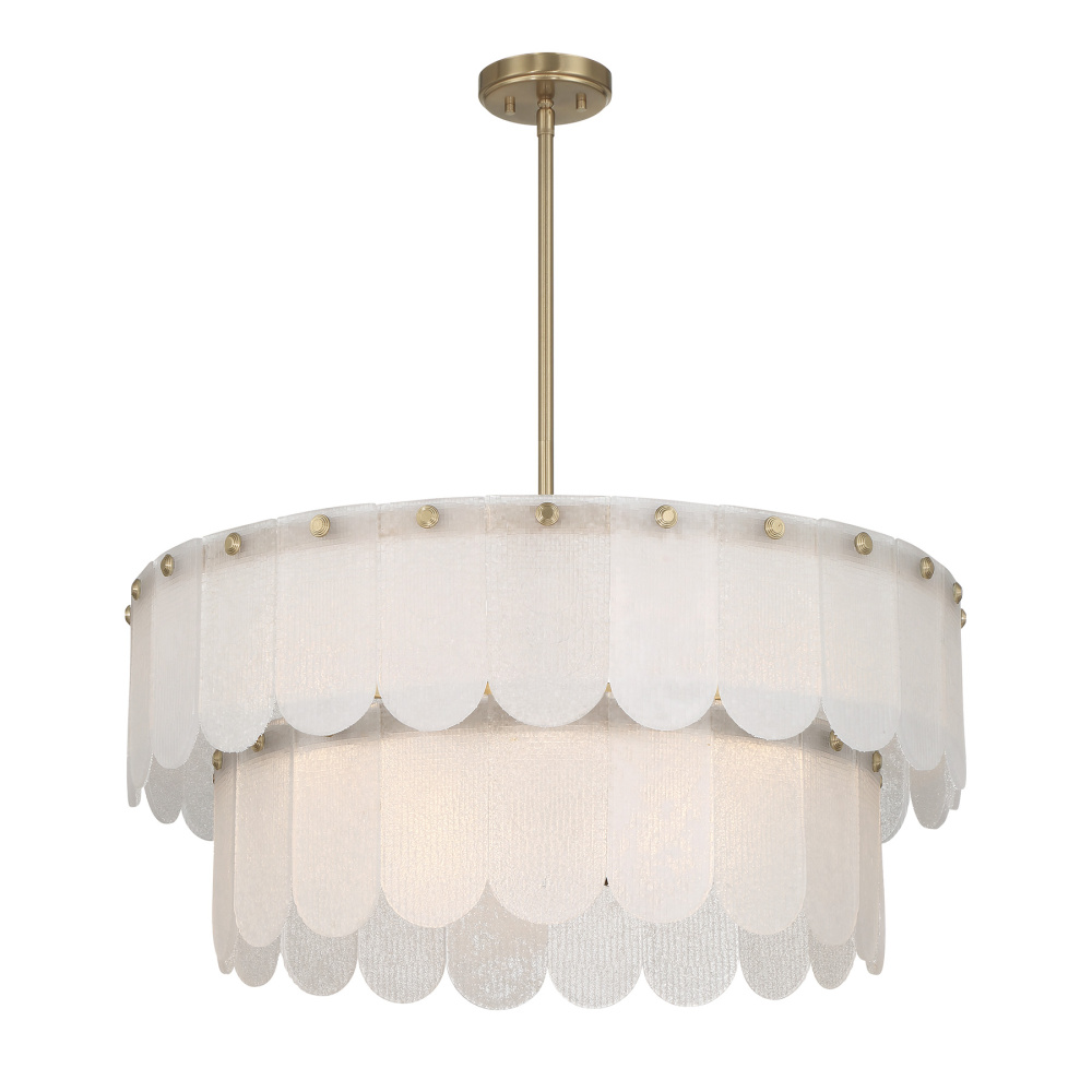 The Savoy House Ashton 10-light two-tier pendant brings soft romance and modern simplicity together in one standout design. Frosted sugar glass petals shimmer with touchable texture while the Noble Brass finish brightens the entire silhouette. The result is a warm, inviting glow with a sophisticated edge. Ashton is 30" wide and has an adjustable height ranging from 14" to 68". It uses ten candelabra size bulbs of up to 60 watts each (bulbs not included). Includes four 12" downrods and one 6" downrod.