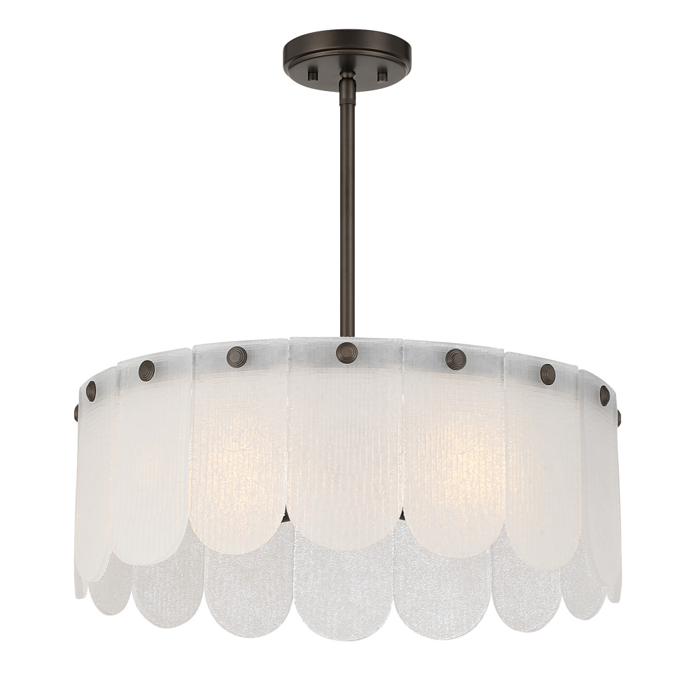 The Savoy House Ashton 4-light pendant blends sweet detailing with versatile design. Petals of frosted sugar glass offer delightful texture and gentle illumination while the Mediterranean Bronze finish adds a bold, grounding contrast. Whether you use it as a hanging pendant or ceiling light, it’s a lovely way to soften and elevate a room. Ashton is 20" wide with an adjustable height from 8" to 60". It uses four candelabra size bulbs of up to 60 watts each (bulbs not included). Includes four 12" downrods and one 6" downrod.