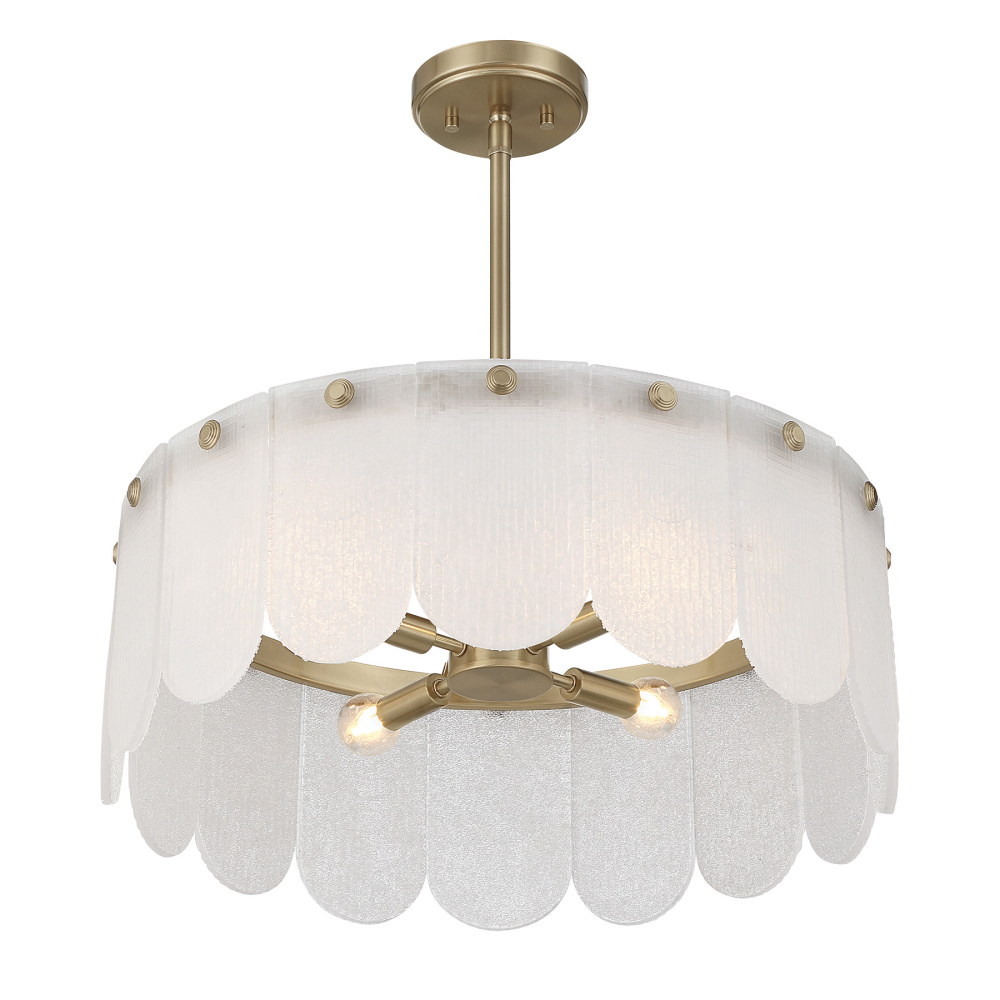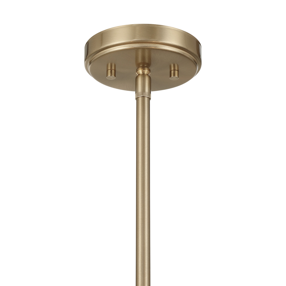 With its luminous Noble Brass finish and delicately textured frosted sugar glass petals, the Savoy House Ashton 4-light convertible pendant adds a warm, inviting radiance to any room. Use it as a pendant or as a semi-flush mount - its minimalist lines and soft glow make it stunning in either form. Ashton is 20" wide with an adjustable height ranging from 8" to 60". It uses four candelabra size bulbs of up to 60 watts each (bulbs not included). Includes four 12" downrods and one 6" downrod.