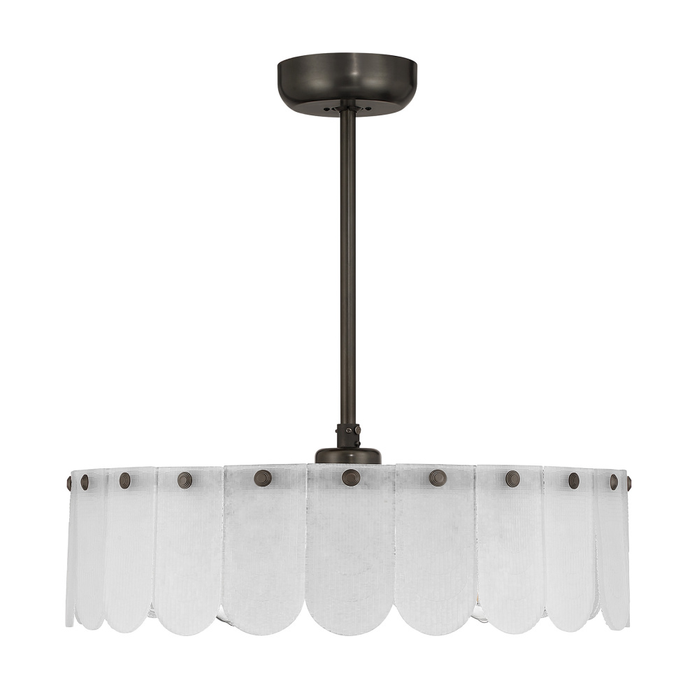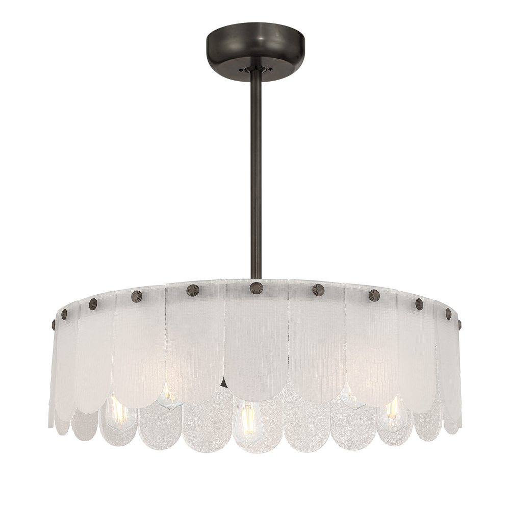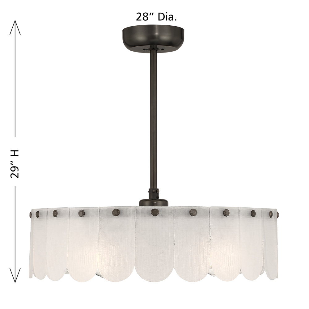 The Savoy House Ashton 5-light Fan D’Lier brings sweet, textural beauty and refreshing comfort together in a single captivating fixture. Frosted sugar glass petals radiate a warm glow around its Mediterranean Bronze frame while the hidden fan quietly circulates air. Ashton is 29" tall and 28" wide. It uses five standard size LED bulbs (included) and includes a handheld remote for easy control. Comes with a 4" downrod and an 18" downrod. Fan D’Liers uniquely blend the best of ceiling fans and chandeliers into an exclusive statement piece.