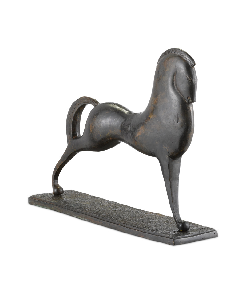 The Assyrian Horse Bronze is made from a lost-wax technique where boiling bronze is poured into a mold covering an original wax sculpture that melts away. Once set, there is a very long process of refining the bronze to give it patina. The Etruscan style and the aged finish of this bronze sculpture make it feel like an antique.