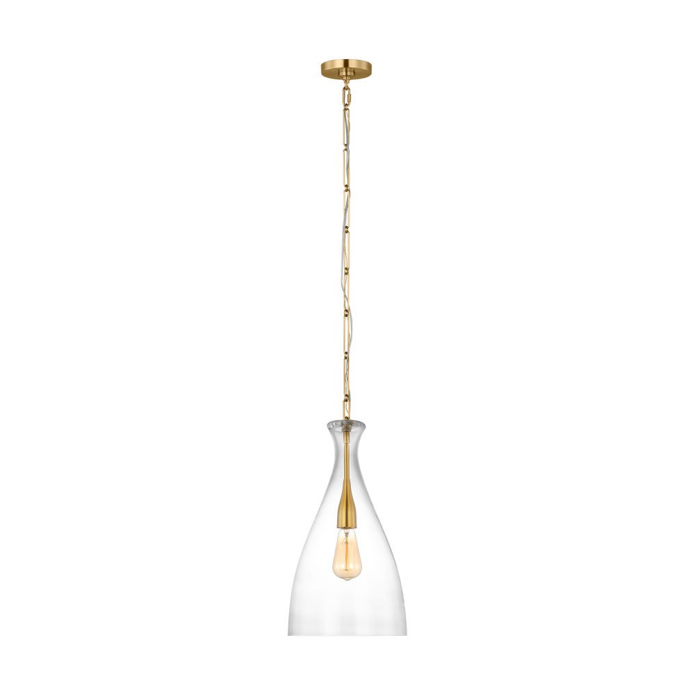Following a classic hourglass shape with a wide taper, the clear glass shade makes a design feature out of the tapered socket cup and bulb. It includes an adjustable chain to vary the drop for multiple uses. This versatile pendant light is a perfect addition over a kitchen island as a single or as a pair, as well as over a bistro or dining table.