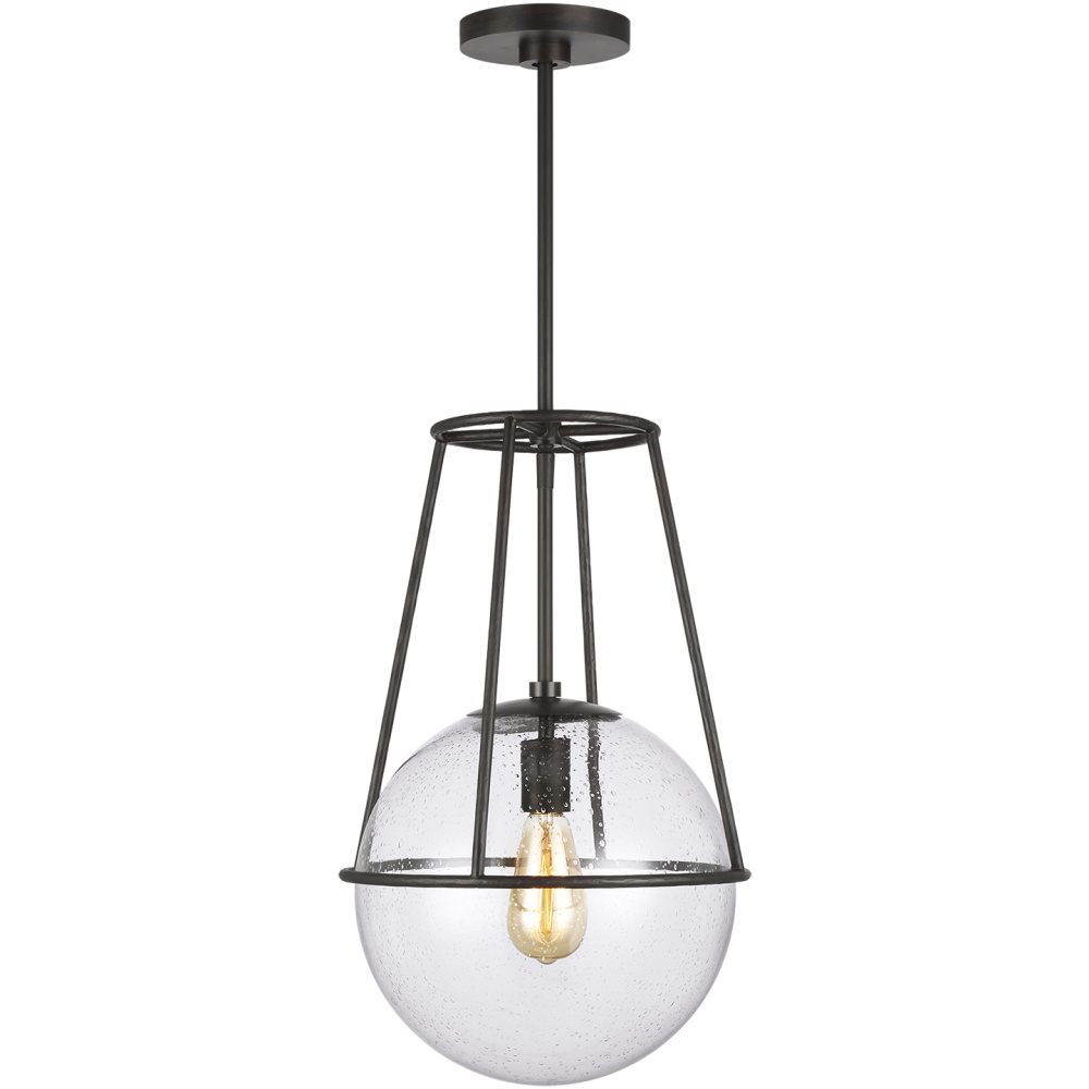 The Atlas one light indoor pendant in aged iron exudes touches of mid-century modern style with rustic undertones. A hand-forged Aged Iron finish pairs with a hand-blown Clear Seeded Glass globe shade to complete this design that's sure to make a statement. The Aged Iron finish is considered a living finish and will develop an increasingly beautiful patina over time.