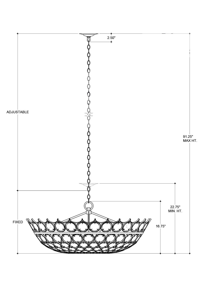 Recycled glass discs are encased in wrought iron in a satin black finish to bring the Augustus Chandelier great aesthetic strength. Design details of note are how unobtrusively the discs are fastened to the frame, the commanding size of the glass chandelier, and the fact that the discs grow smaller as they descend to the bottom of the shade. Adjustable from 22.75" to 91.25" with use of included chain/rod kit/cable. If your space calls for a longer drop, additional chain/rods/cable is available for purchase.