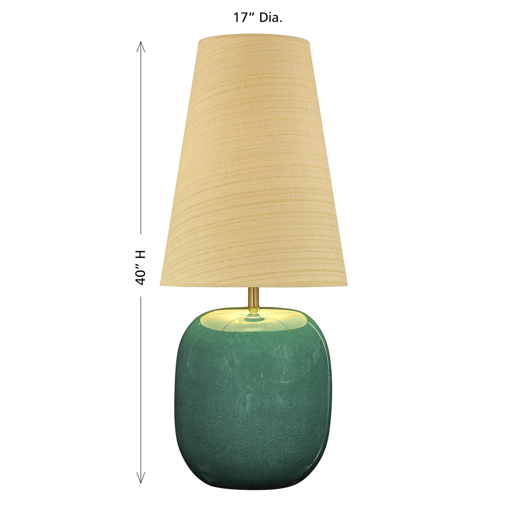 The Savoy House Aurora 1-light table lamp was designed by award-winning interior designer and TV host Breegan Jane. Its ceramic body glows in Breegan’s signature teal, a color she considers both soulful and transportive, and is finished with a shimmering crackle glaze that reveals intricate layers of depth. Paired with a woven parchment shade and Warm Brass accents, Aurora brings a relaxed yet luxurious presence to any room. It is 40" in height and 17" in width. It uses one standard size bulb of up to 100 watts. Bulb not included.