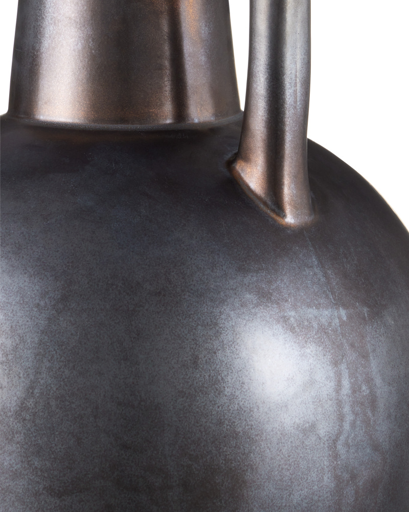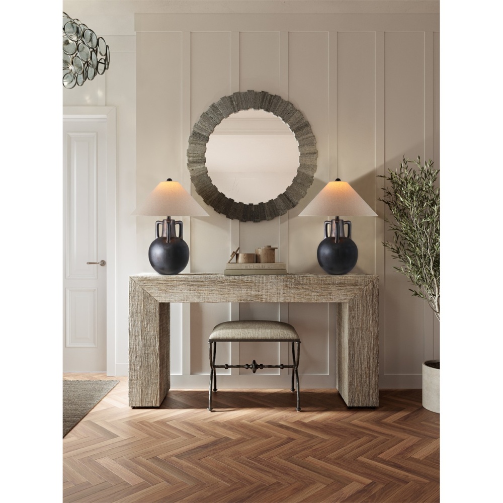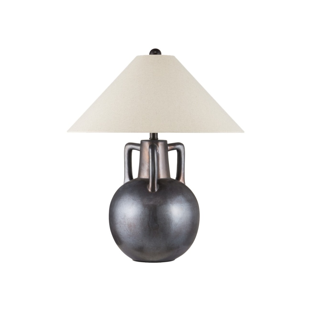The Autry Table Lamp has a three-handled jug-shaped body that gleams thanks to the hand-sprayed reactive glaze on its surface, which creates a metallic glow that varies like marbling. This artisanal treatment takes place as the brown lamp is being fired. The bronze hardware and finial match the ceramic body tonally, and the lamp is topped with an empire shade that complements the shape.