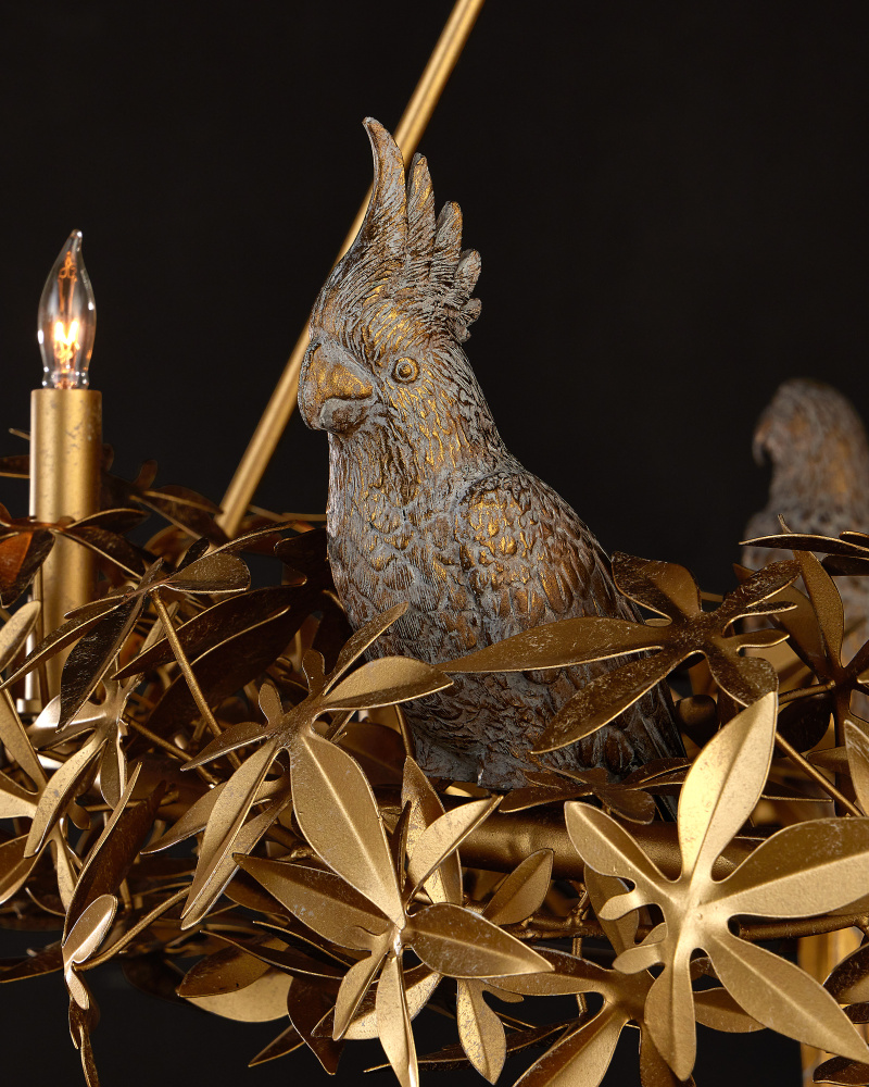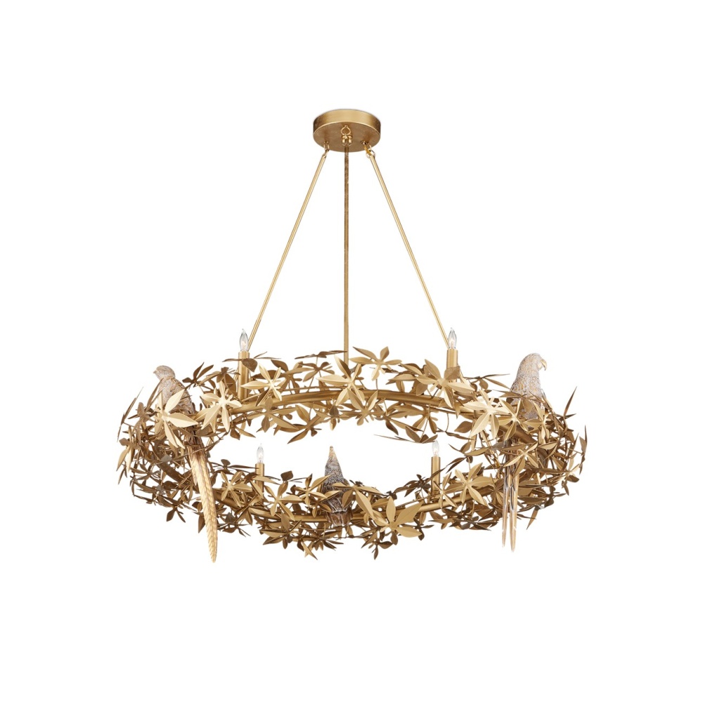 The Aviary Gold Ring Chandelier is a gleaming example of sophisticated biophilic design. Inspired by an antique fixture, the gold chandelier has flowing leaf and floral motifs in a Swedish Gold finish that match the tails of birds perching within the foliage. Originally carved by a sculptor, the cockatiels, sparrows, and macaws were carefully recreated out of composite to match the original works of art. The six-light chandelier is dimmable. Adjustable from 41.25" to 116.75" with use of included chain/rod kit/cable. If your space calls for a longer drop, additional chain/rods/cable is available for purchase.