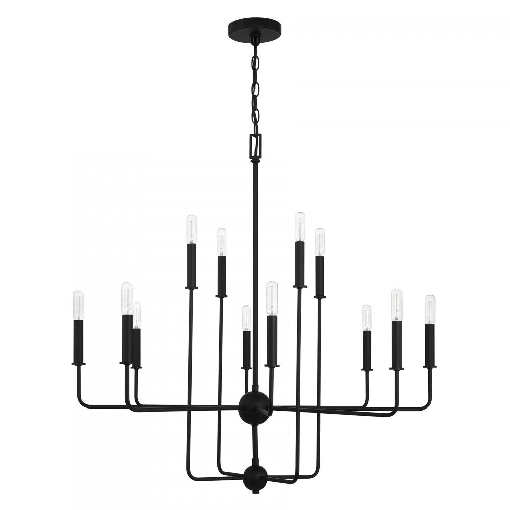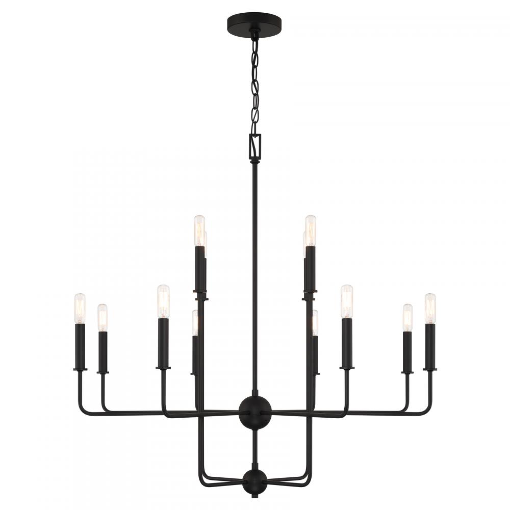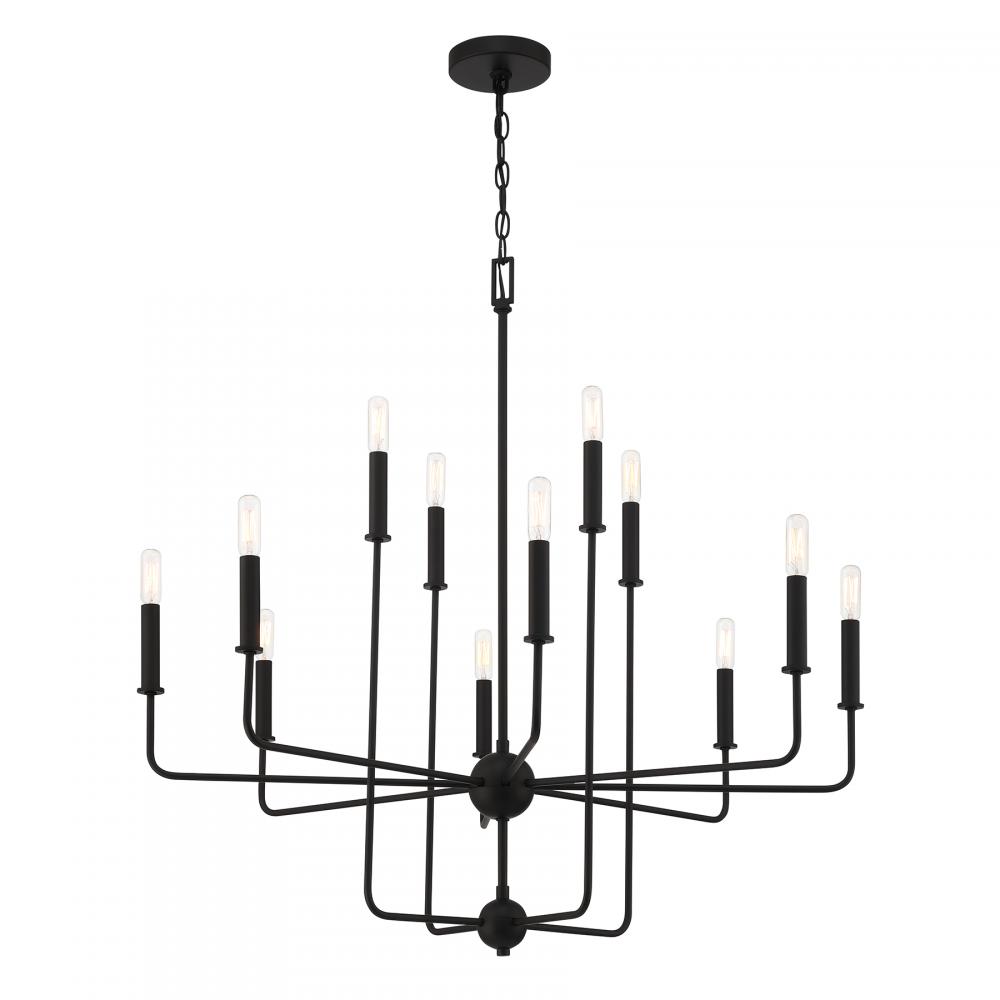Elegant in its simplicity, the Savoy House Avondale 12-light chandelier brings streamlined style to any space. Finished in Matte Black. Avondale is 33.75" in height and 34" in width. It uses twelve candelabra size bulbs of up to 60 watts per bulb. Bulbs not included.