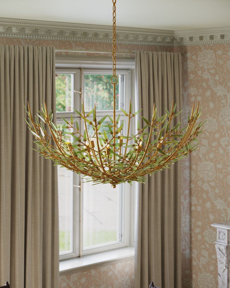 The Babylon Chandelier is formed from slender, curving stems of wrought iron in a contemporary gold leaf finish that have been shaped into an elegant bowl-like silhouette. The tapering spikes are adorned with elongated green glass leaves, each hand-cut from recycled wine bottles, that look as if they are being stirred by a breeze. The edges are individually polished by hand and placed on the frame with metal pins that resemble the shapes of the glass pieces. There will be slight variations in color in the leaves on this eight-light gold chandelier that is dimmable. Adjustable from 33" to 101" with use of included chain/rod kit/cable. If your space calls for a longer drop, additional chain/rods/cable is available for purchase.