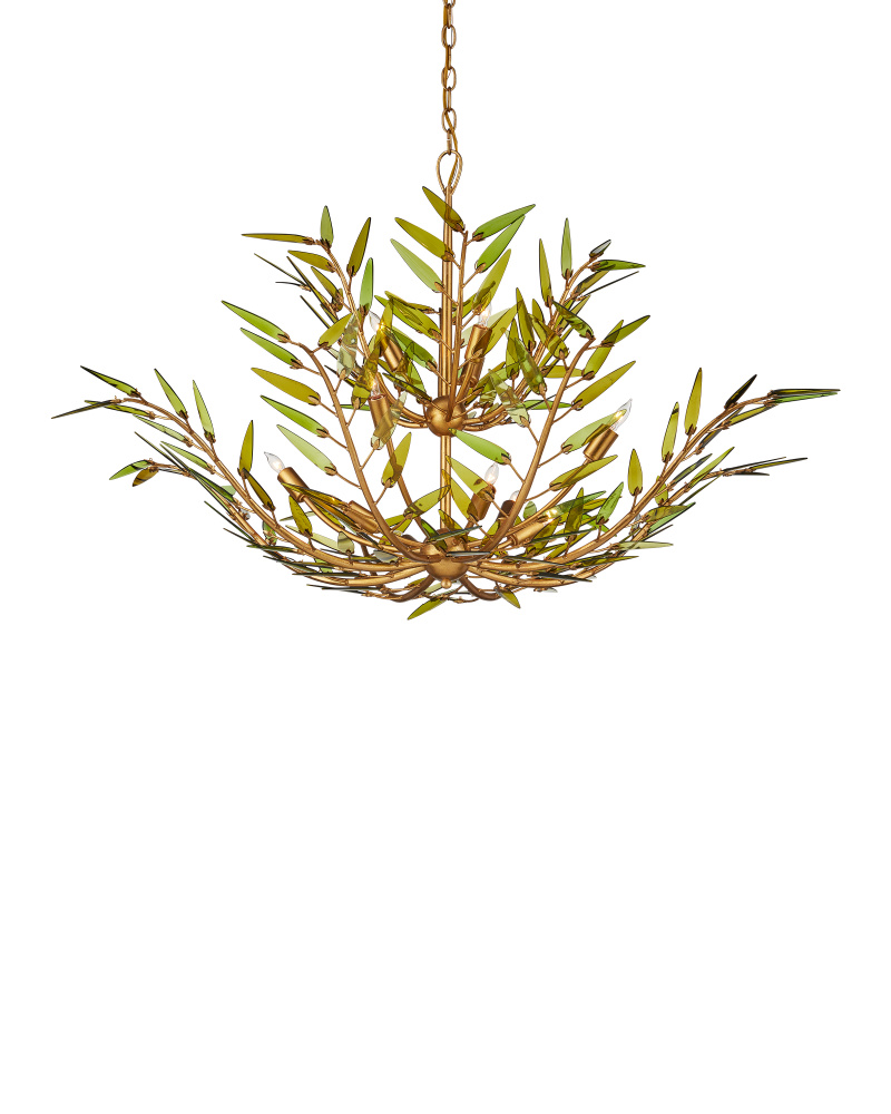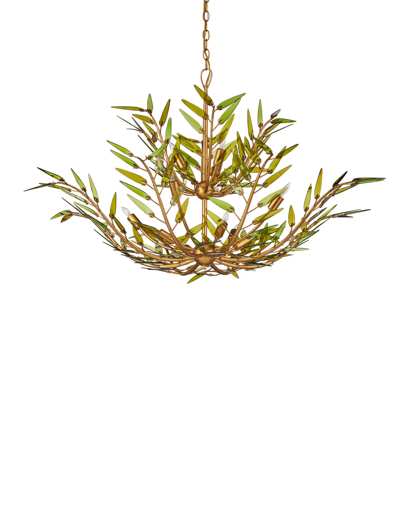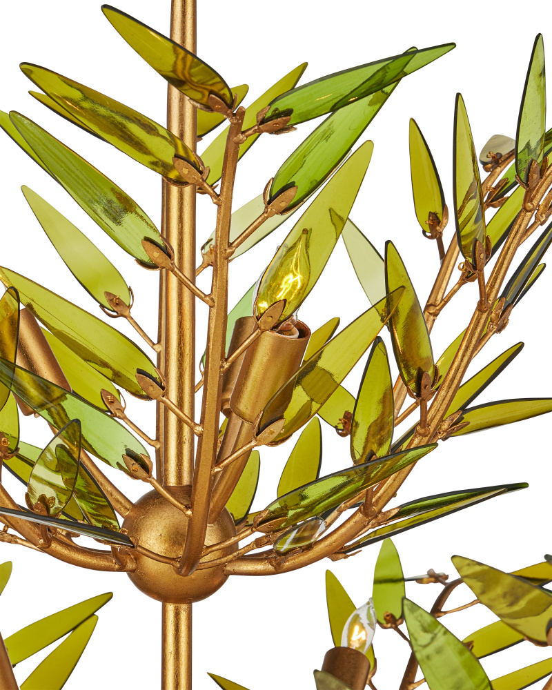 The Babylon Two-Tier Chandelier is formed from slender, curving stems of wrought iron in a contemporary gold leaf finish that have been shaped into an elegant floral silhouette. The tapering spikes are adorned with elongated green glass leaves, each hand-cut from recycled wine bottles, that look as if they are being stirred by a breeze. The edges are individually polished by hand and placed on the frame with metal pins that resemble the shapes of the glass pieces. There will be slight variations in color in the leaves on this dimmable 11-light chandelier. Adjustable from 33" to 101" with use of included chain/rod kit/cable. If your space calls for a longer drop, additional chain/rods/cable is available for purchase.