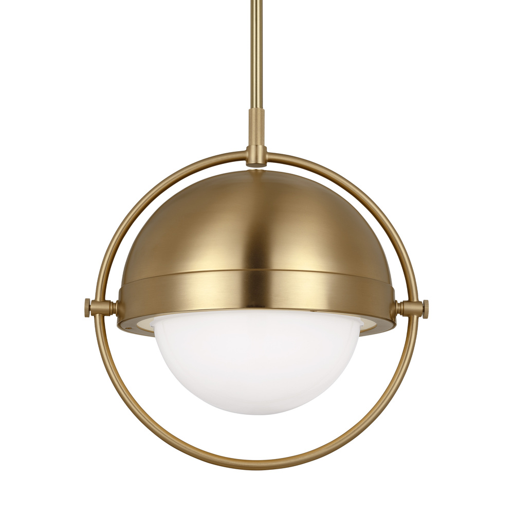 The Bacall one light indoor pendant by Thomas O'Brien is a modern rotating pendant with a deco-era cinematic feel. Glowing beneath the metal shade, the Milk White glass shade softens the light from the bulb inside. Perfect as a direct downlight, it can look unique by positioning it to the right, left, or even rotated entirely upwards.
