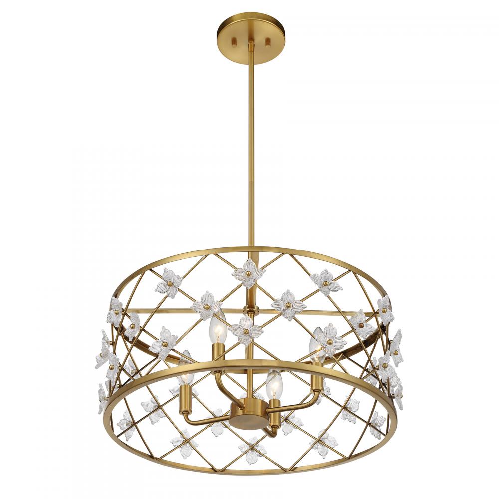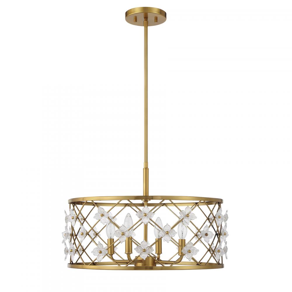 The Savoy House Bailey 4-light pendant offers a fresh take on a familiar form. The open drum-shaped shade is finished in Warm Brass and has a latticework pattern festooned with glass flowers. It mixes edgy with classic in an impeccable way and it can even be converted for use as a ceiling semi-flush mount light. Bailey is 20" in width and has an adjustable height ranging from 13.5" to 67.5". It uses four candelabra size bulbs of up to 60 watts per bulb. Bulbs not included. Comes with four 12" downrods and one 6" downrod.