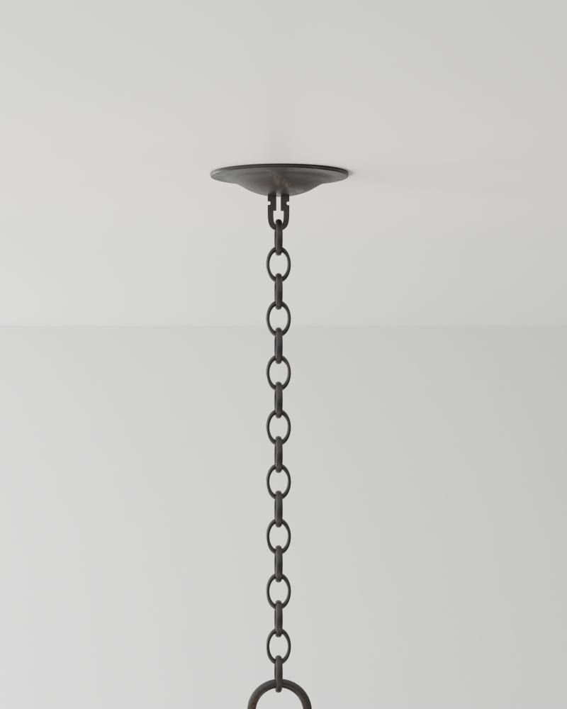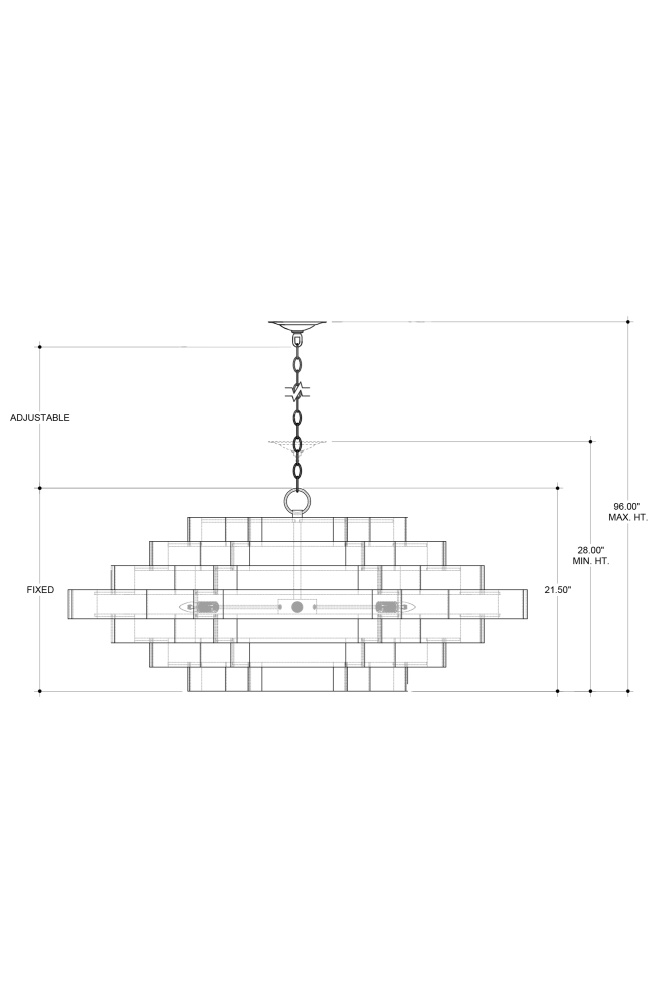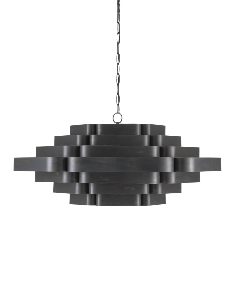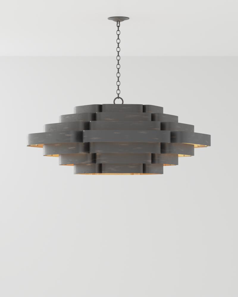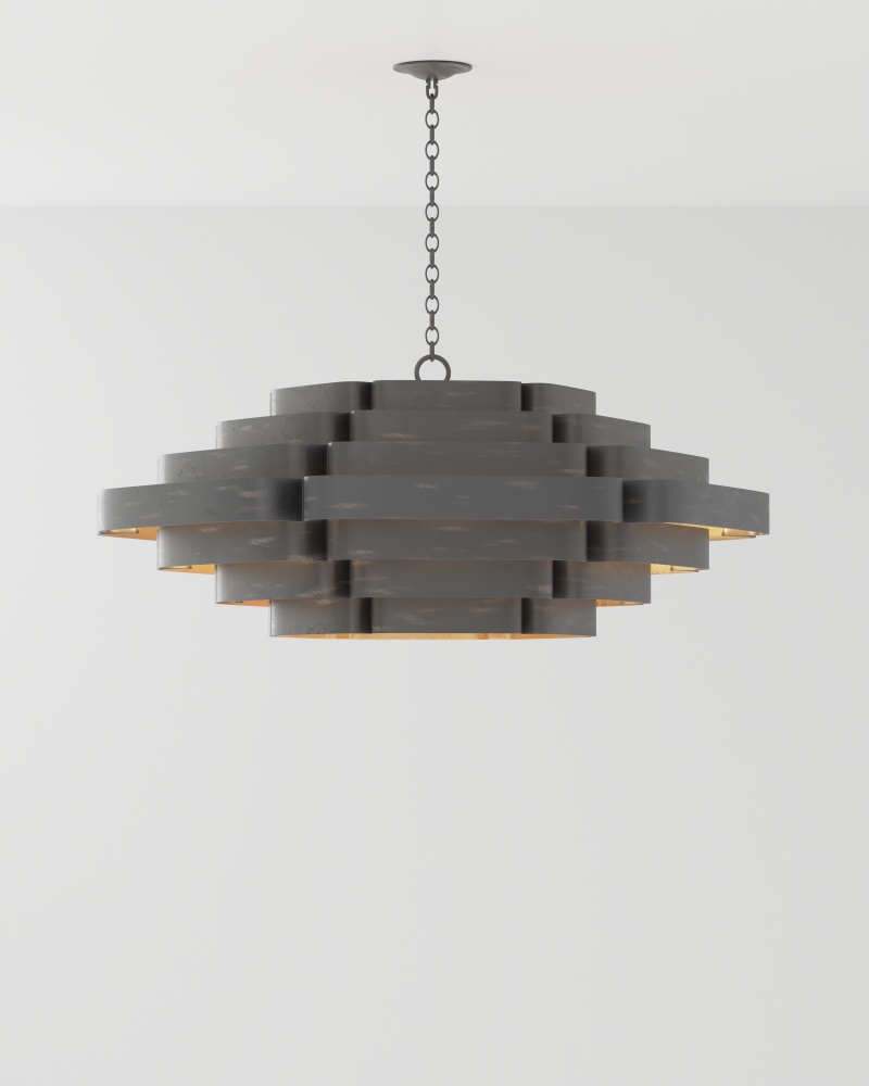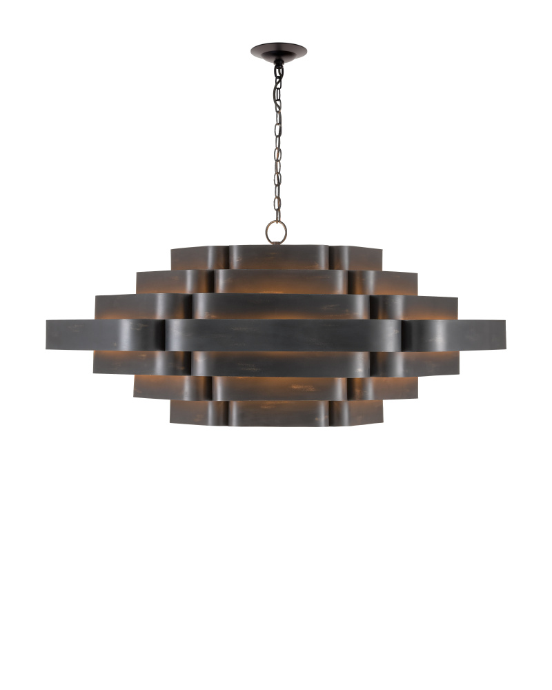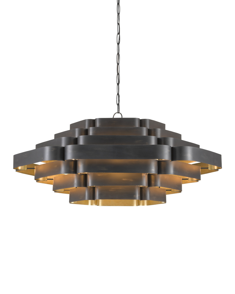 In the Bunny Williams collection, the Bailey Chandelier is a large chandelier with a two-tone finish: contemporary gold leaf on the interior and French black on the exterior. Ambient light radiates between the ribbons of wrought iron in a warm glow due to the gold interior. The black chandelier has six lights so that glow is abundant. Adjustable from 28" to 96" with use of included chain/rod kit/cable. If your space calls for a longer drop, additional chain/rods/cable is available for purchase.