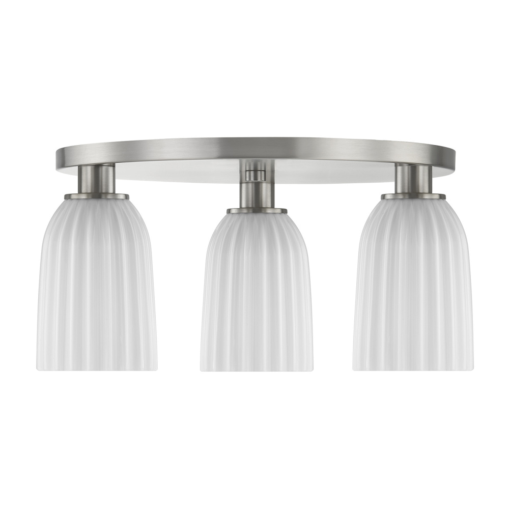 Give any ceiling a clean, contemporary lift with the Savoy House Baldwin 3-light flush mount. The Satin Nickel finish pairs beautifully with the ribbed opal glass shades, which introduce subtle texture and a soft diffusion of light. Baldwin is 8.13" in height and 18" in width. It uses three standard size bulbs of up to 60 watts per bulb. Bulbs not included.