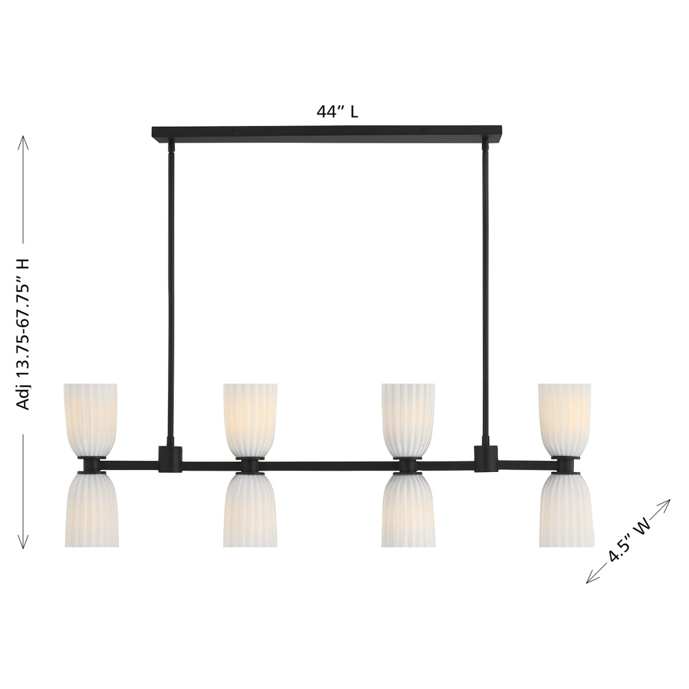 Bold contrast meets elegant simplicity in the Savoy House Baldwin 8-light linear chandelier. Its Matte Black finish highlights the gentle curves of the ribbed opal glass shades, creating a striking statement that still feels refined and airy. Baldwin is 44" in length, 4.5" in width and offers an adjustable height ranging from 16.75" to 64.75". It uses eight standard size bulbs of up to 60 watts per bulb. Bulbs not included. Includes eight 12" downrods and two 6" downrods.