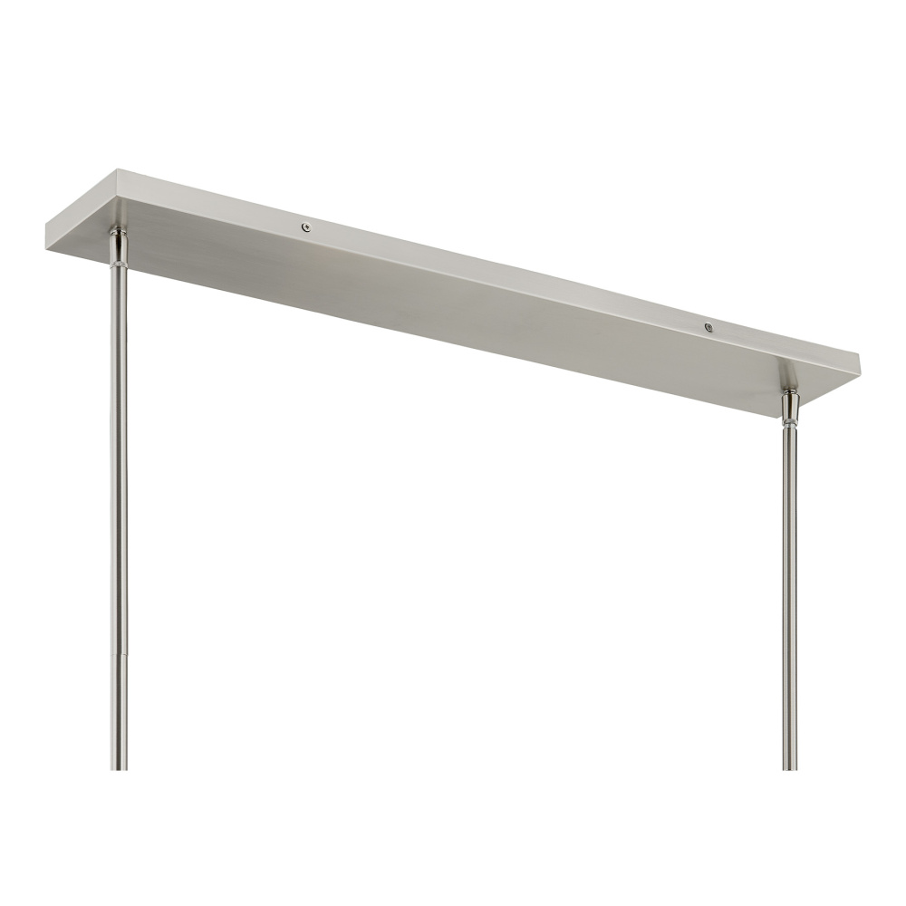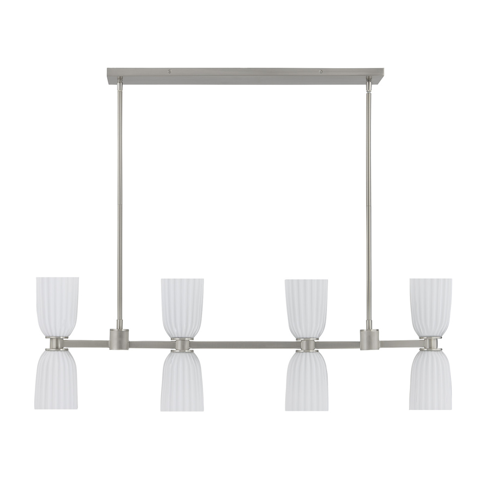 Bring clean, luminous style to your home with the Savoy House Baldwin 8-light linear chandelier. A sleek Satin Nickel finish pairs effortlessly with the softly ribbed opal glass shades, giving this design a beautifully balanced, contemporary feel. Baldwin is 44" in length, 4.5" in width and offers an adjustable height ranging from 16.75" to 64.75". It uses eight standard size bulbs of up to 60 watts per bulb. Bulbs not included. Includes eight 12" downrods and two 6" downrods.