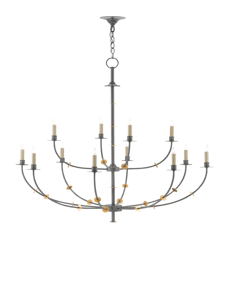 If our Balladier Chandelier could sing, it would belt out its songs with its arms spread wide and high while beaming its light to the rafters! Our designers have taken this classically shaped chandelier and given it several modern tweaks in the thinness of the arms in a Hiroshi gray finish and the circlets in contemporary gold leaf sprinkled along its frame. Though this twelve-light fixture would suit a transitional interior just fine, it will also look stellar in an industrial loft.