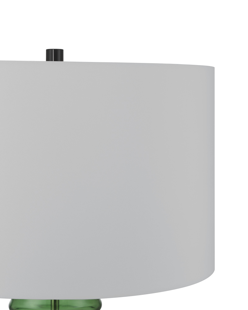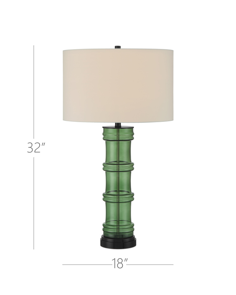 The Balsam Green Table Lamp is a contemporary take on Chinoiserie with its bamboo-shaped silhouette made of glass. The hardware in a glossy black finish heightens the modern feel of the lamp’s profile, as does the black optic crystal base on which the body sits. The drum shade is fastened to the lamp with a black finial that completes the piece.