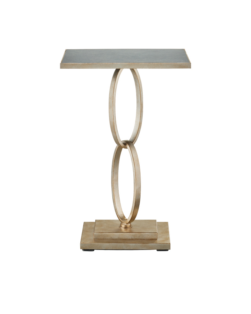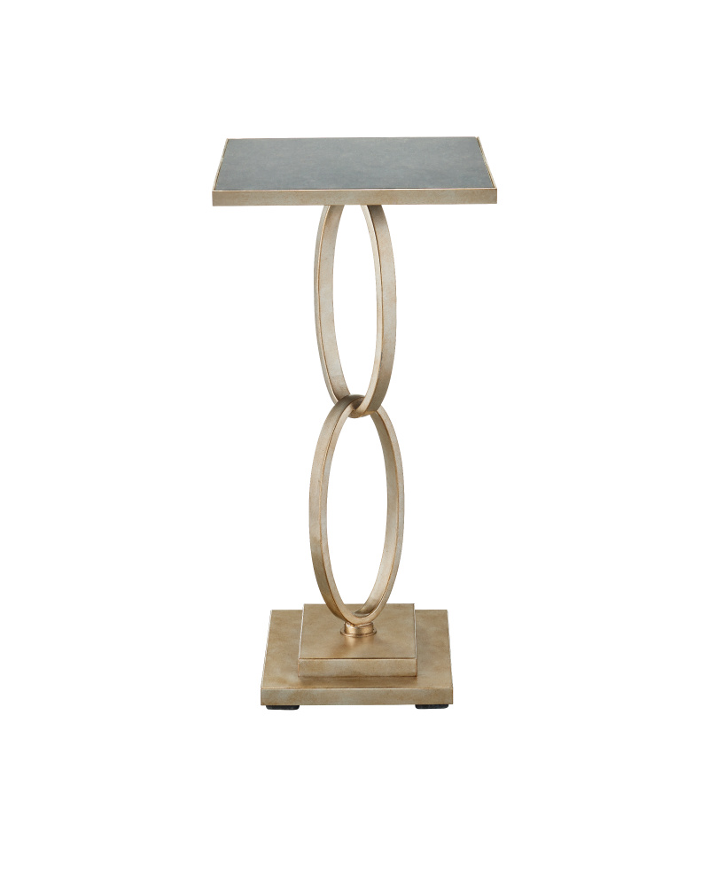 The Bangle Champagne Accent Table will ornament a room with transitional style. The silvered-gold accent table with its antique mirror top has an open design made of two wrought-iron rings that inspired its name. The interconnecting bangles are fitted between a stacked base and a rectangular top, which is slightly larger than the base.