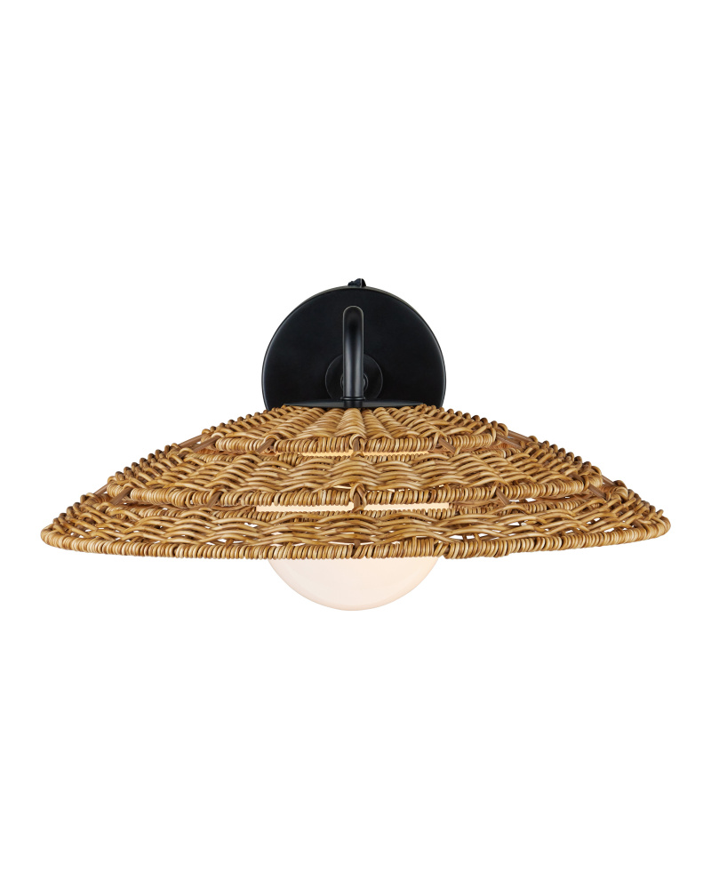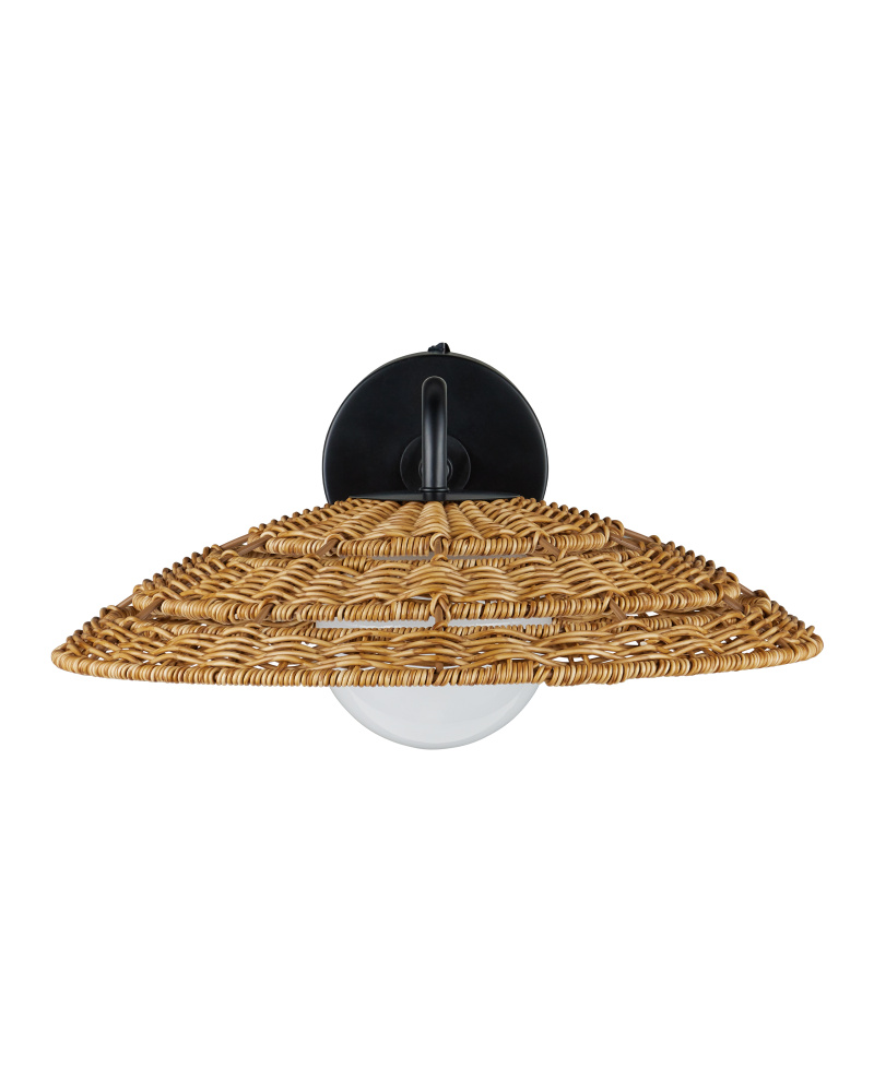 The Barbary Outdoor Wall Sconce has an inverted bowl-shaped shade made of all-weather wicker that can easily withstand the elements, as will the metal backplate and gooseneck arm in a black powder-coated finish. The uniform weave on the tan wall sconce is painstakingly achieved by hand. Another sophisticated detail is how the milk-glass globe on the one-light sconce glows through the circular cut out. The Barbary is wet location-tested so it is ideal for illuminating patios and porches.