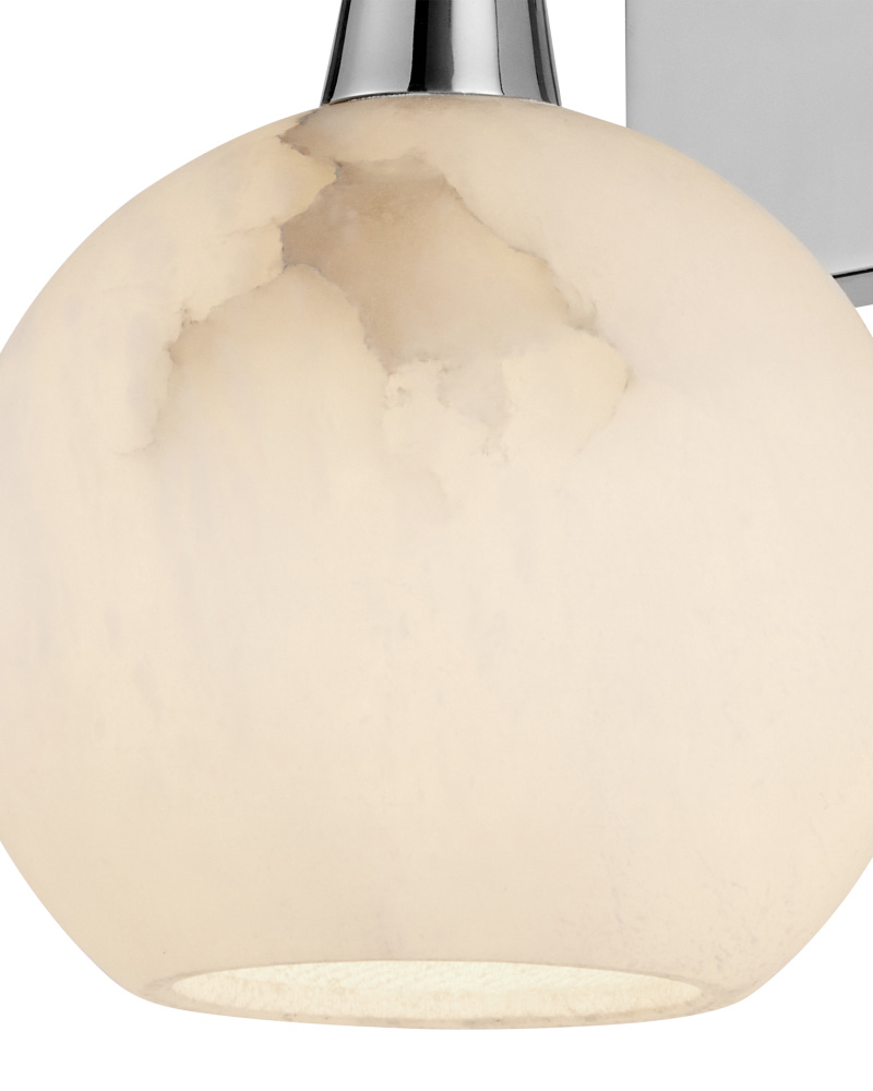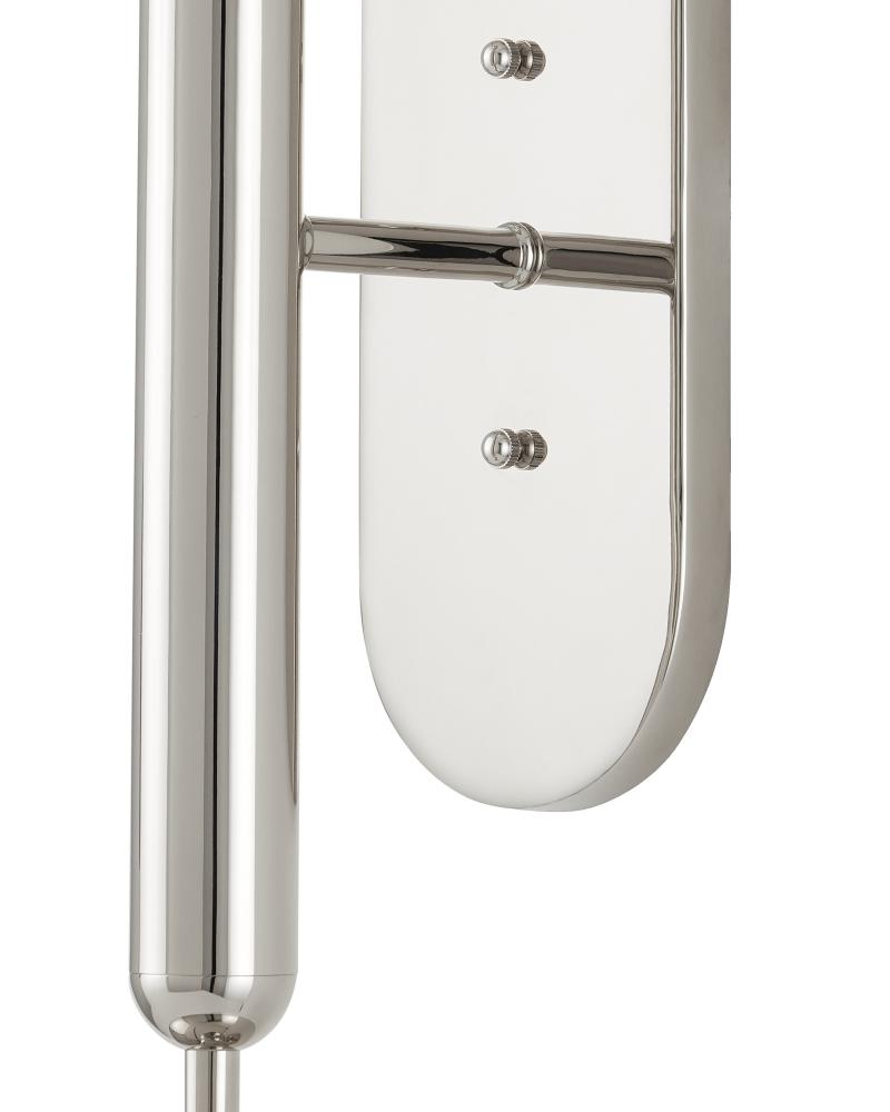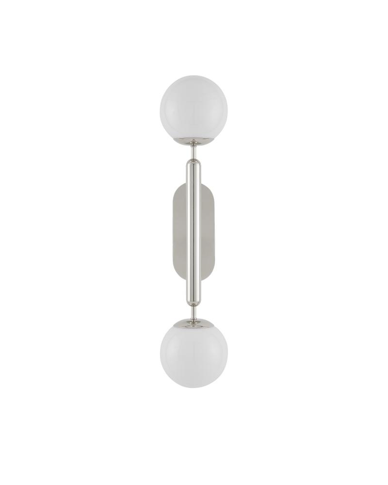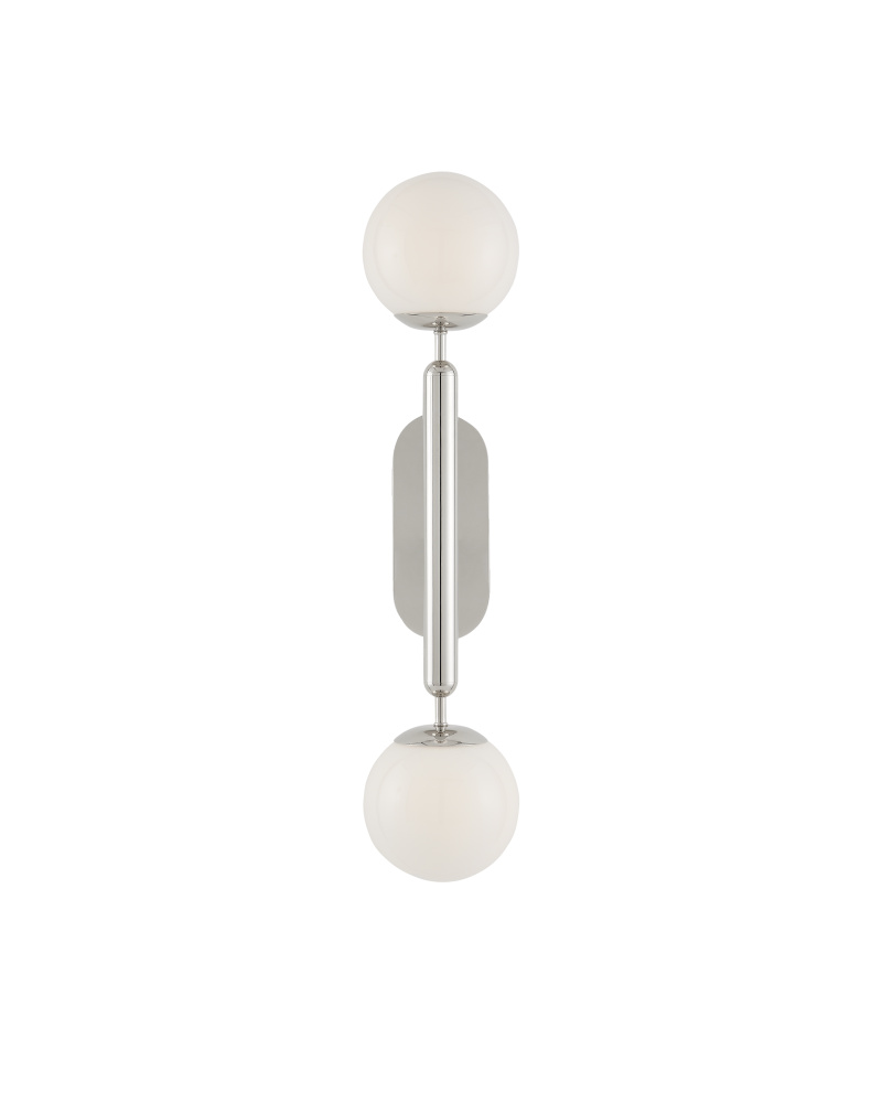 The Barbican Double-Light Nickel Wall Sconce features a tubular stem that balances cup-like shapes, into which translucent glass globes nestle. Keeping the design minimal, the button-like hardware is streamlined to perfection. This silver sconce is part of the Bagno Collection of damp-rated lighting, designed specifically for bathrooms. The Barbican can also be mounted sideways to fit over a mirror.