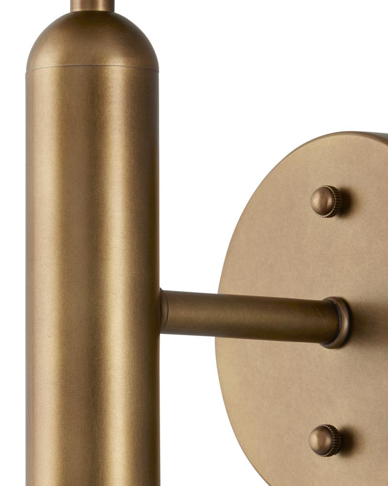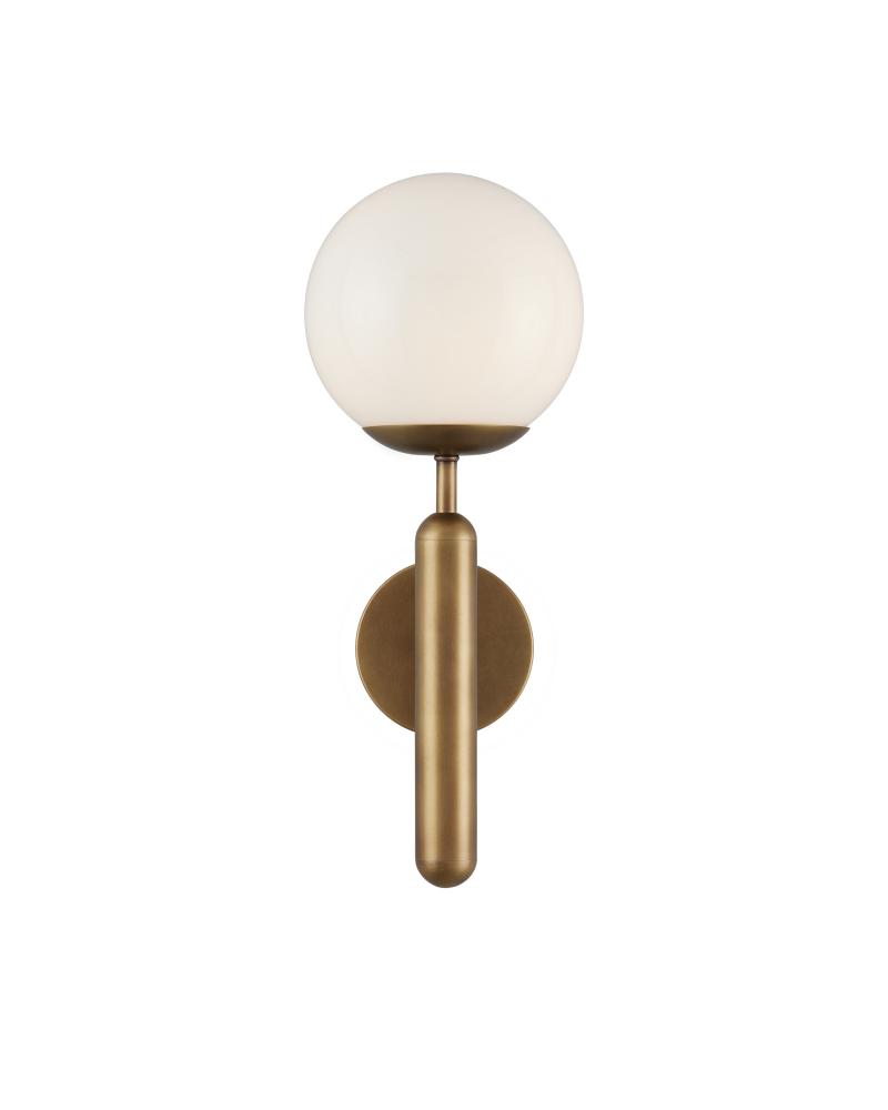 The Barbican Single-Light Brass Wall Sconce features a tubular stem that balances a cup-like shape, into which a translucent glass globe nestles. Keeping the design minimal, the button-like hardware is streamlined to perfection. This gold sconce is part of the Bagno Collection of damp-rated lighting, designed specifically for bathrooms. The Barbican can also be mounted sideways to fit over a mirror.
