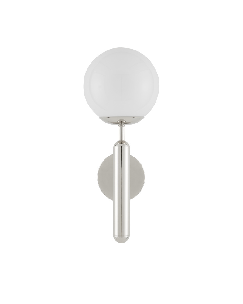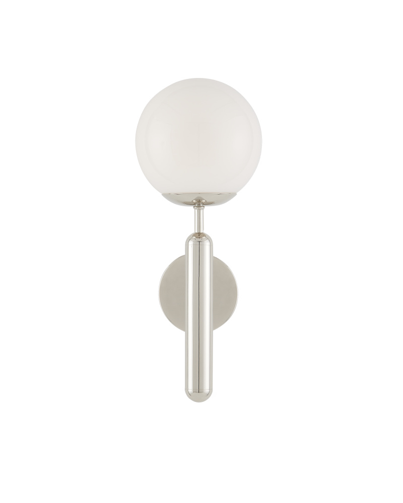 The Barbican Single-Light Nickel Wall Sconce features a tubular stem that balances a cup-like shape into which a translucent glass globe nestles. Keeping the design minimal, the button-like hardware is as streamlined as possible. This silver sconce is included in our Bagno Collection of damp-rated lighting designed specifically for bathrooms. The Barbican can also be mounted sideways to fit over a mirror.