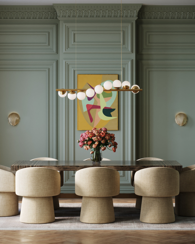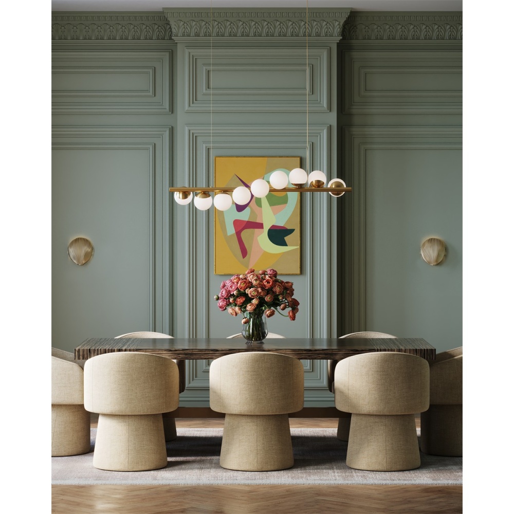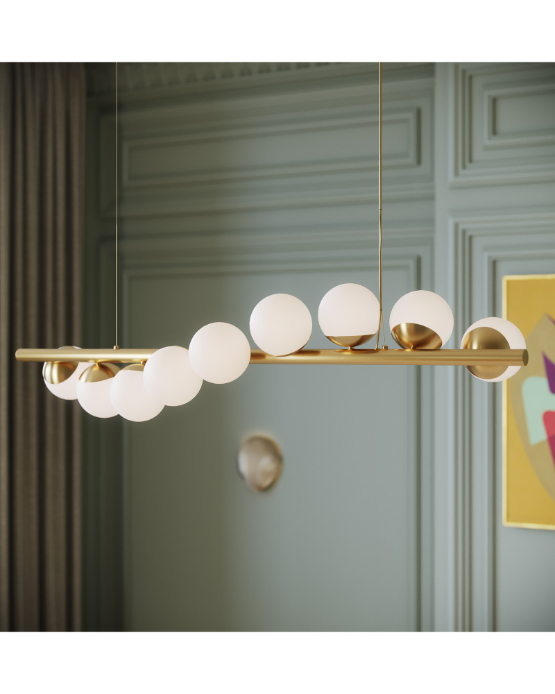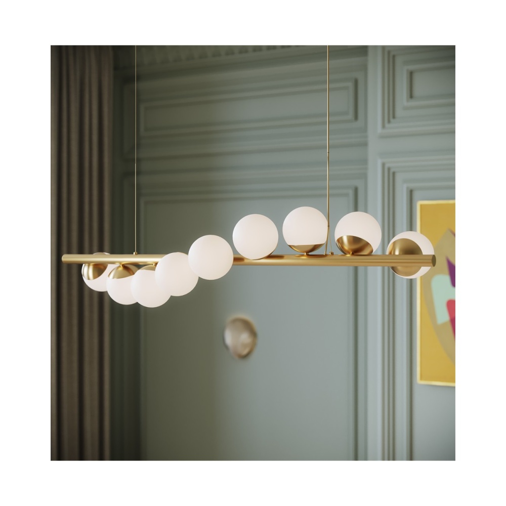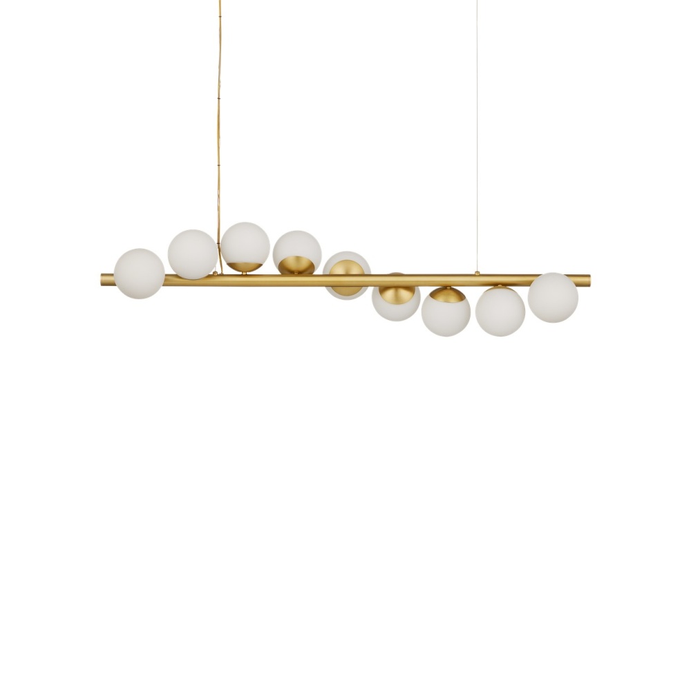 A playful arrangement of globes that meander around a central bar as beautifully as a string of pearls, the Barcarolle Linear Chandelier has tremendous personality. The plated metal in a brushed brass finish is a warm element of this design, while the white globes that softly glow are pale contrasts. The feeling of movement that this fixture creates will make it a conversation starter in any space. Adjustable from 15" to 150" with use of included chain/rod kit/cable. If your space calls for a longer drop, additional chain/rods/cable is available for purchase.