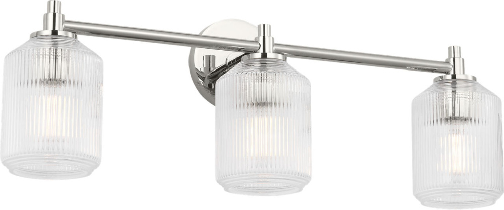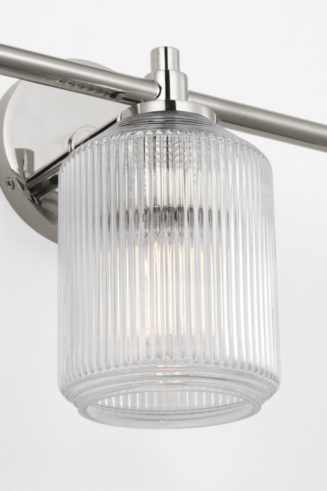 The Barstow 26" Vanity by Chapman & Myers brings the full expression of the collection’s prismatic inspiration to larger bath environments. Its ribbed clear glass shade—cut vertically around the body and horizontally at the top and base—delivers a refined, finished appearance that feels both classic and contemporary. Framed by a minimal metal structure, the 26" fixture is ideal for double-sink vanities or expansive layouts, where its sculptural glass and clean lines create a focal point of quiet elegance and enduring style.