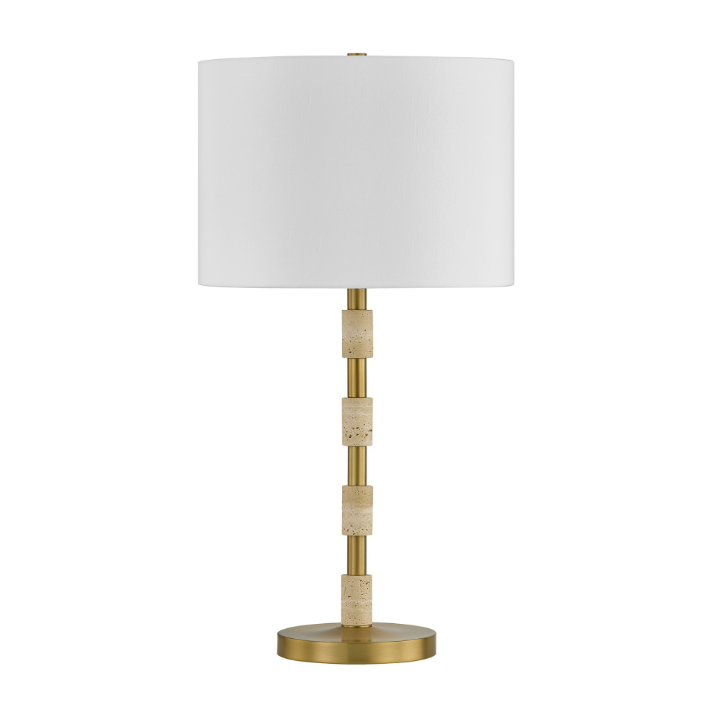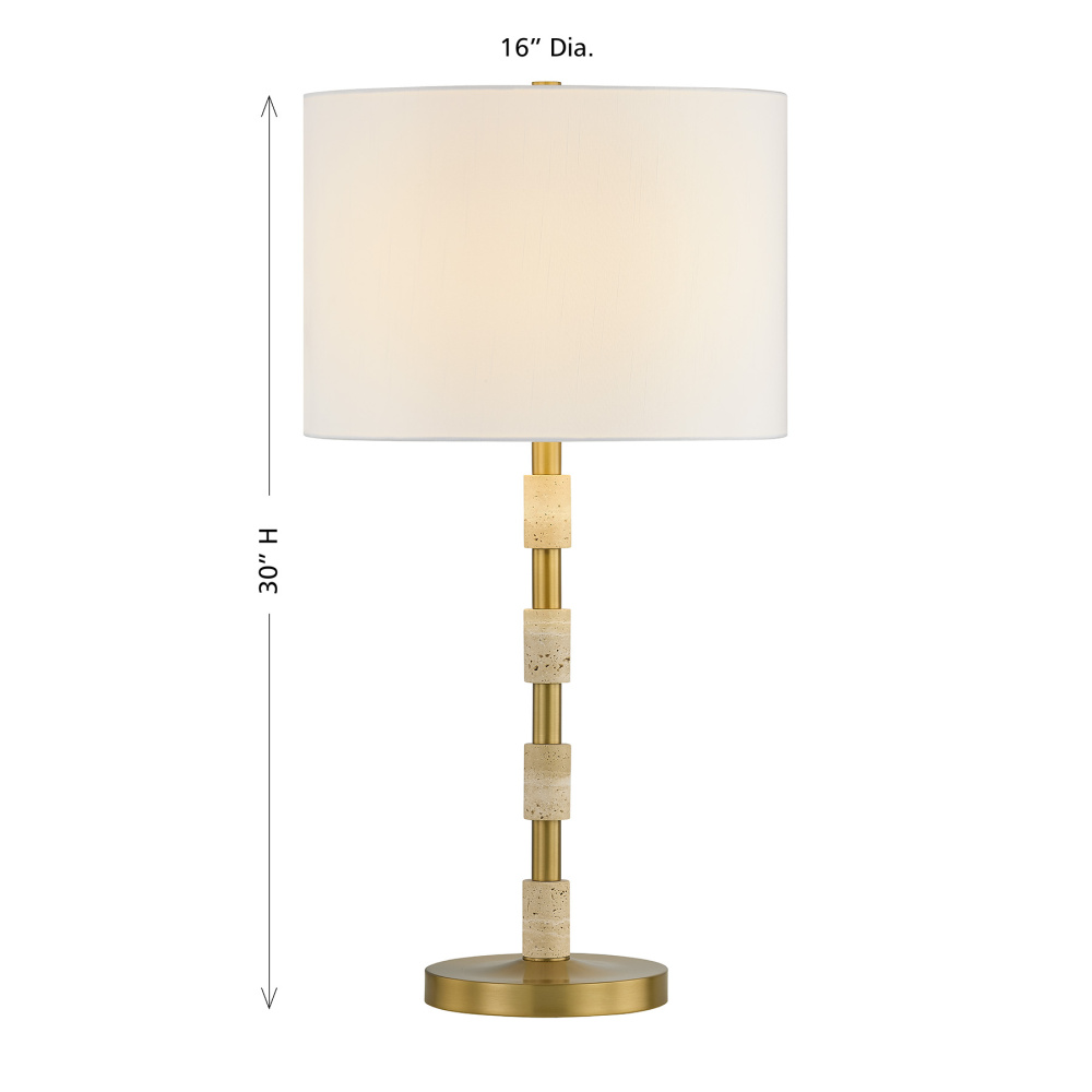 The Savoy House Bartow 1-light table lamp, designed by award-winning interior designer Dann Foley, infuses modern refinement with nature's quiet charm. Its sleek Warm Brass frame is paired with light travertine accents, each uniquely textured and showcasing the allure of naturally formed patterns. A white fabric shade brings a crisp, airy balance, producing a soft ambient glow that elevates any tabletop. Bartow is 30" in height and 16" in width. It uses one standard size bulb of up to 100 watts. Bulb not included.
